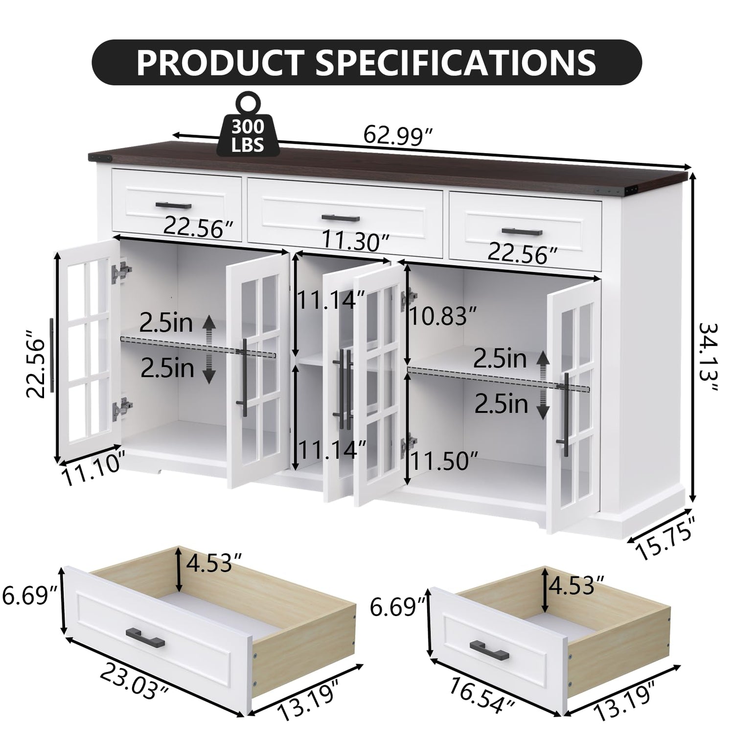 - [Ample Storage Space]-Ample storage space inside and on top of the large buffet sideboard cabinet. 63" wide tabletop arranges your daily utensils, such as coffee machine and microwave. 3 large drawers allow you to classify your tableware, making your essentials close to hand. 2 double-door cabinets and one single-door cabinet can store wine glasses and bottles, and the cabinet's adjustable shelves allow you to personalize the height of shelves, no longer worrying about "too tall to put in".