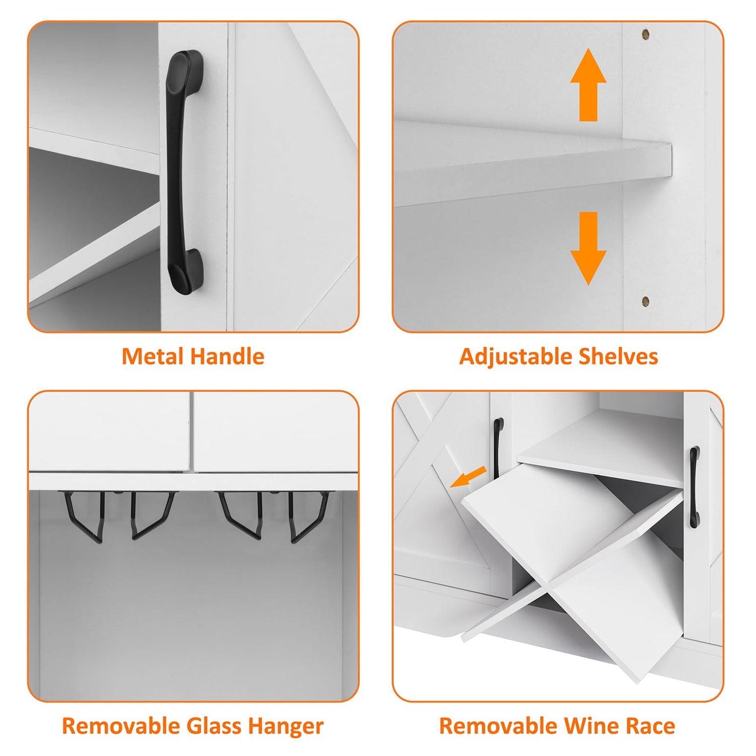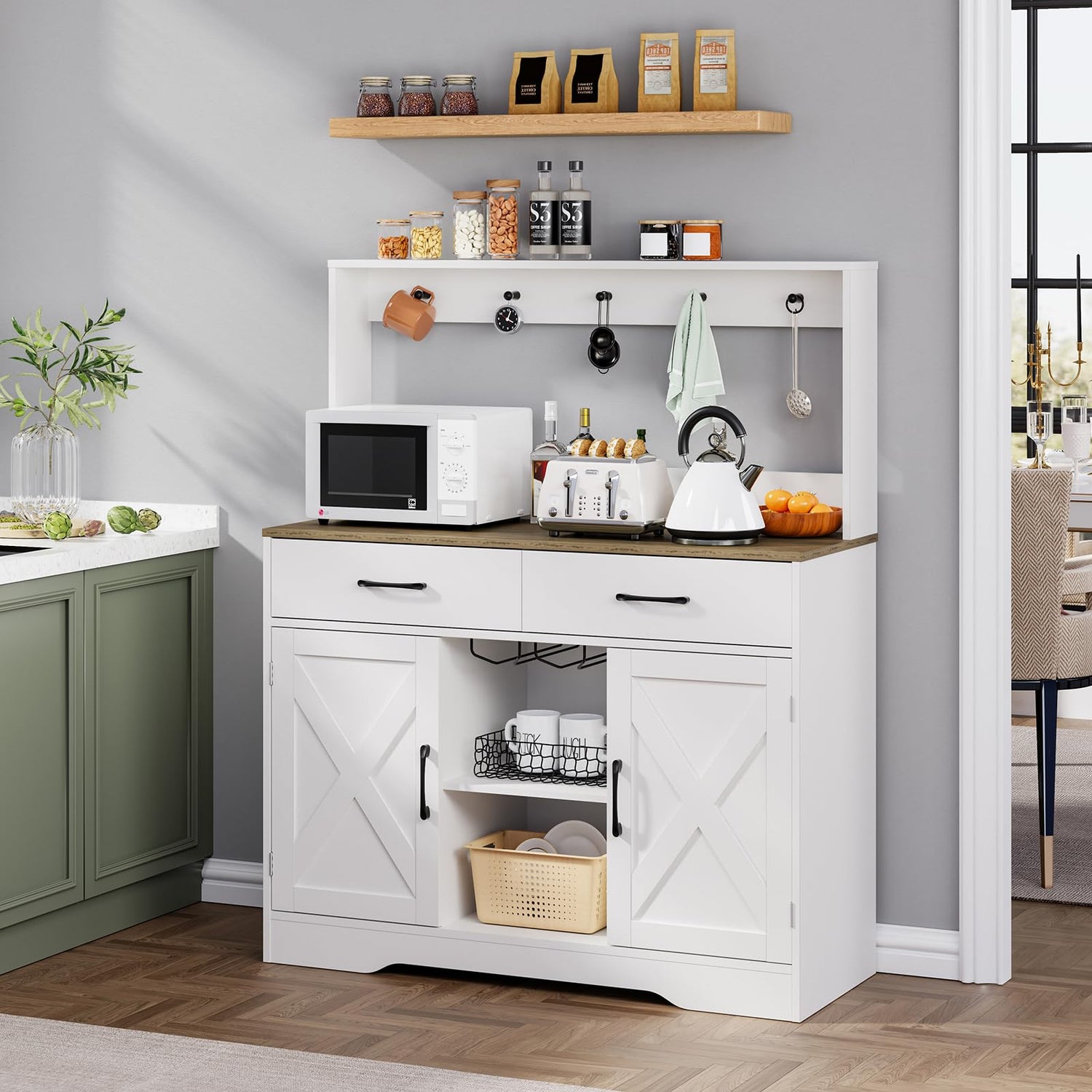 - 【Modern & Farmhouse Design】The rustic wood grain tabletop and X-shaped doors flawlessly combine to create a perfect blend of modern and farmhouse styles. Clean lines blend with the classic white color to create a refreshing appearance for this white coffee bar station, which could complement any style of room.