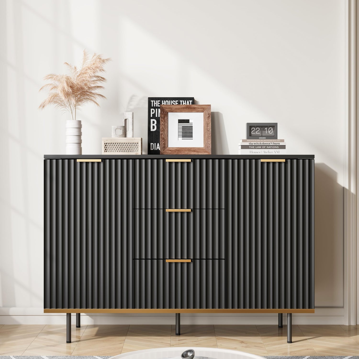 - Elegant fluted cabinet: A fluted door, buffet cabinet in black. This sideboard cabinet is a perfect choice for those who appreciate buffets & sideboards. The 2-door with 3 drawers cabinet provides ample storage space.
