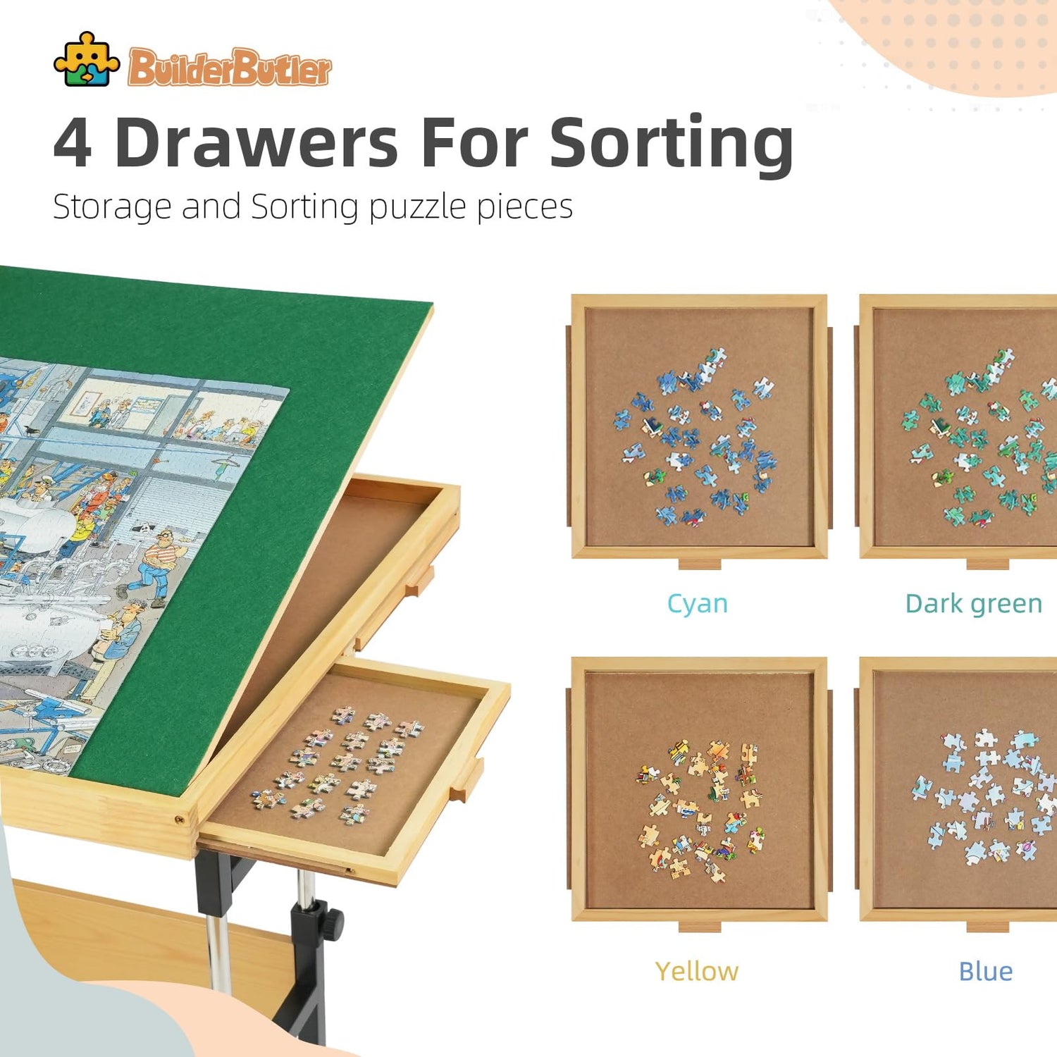 - 4 Drawers & Protective Cover: The BuilderButler puzzle table features four wooden drawers that allow you to efficiently sort and organize puzzle pieces by difference. Each drawer is equipped with secure handles to ensure they stay closed during transportation. The transparent protective cover shields your puzzle from dust, water, and curious pets, ensuring your puzzle remains undisturbed and protected between sessions, making your puzzling experience more enjoyable and organized.