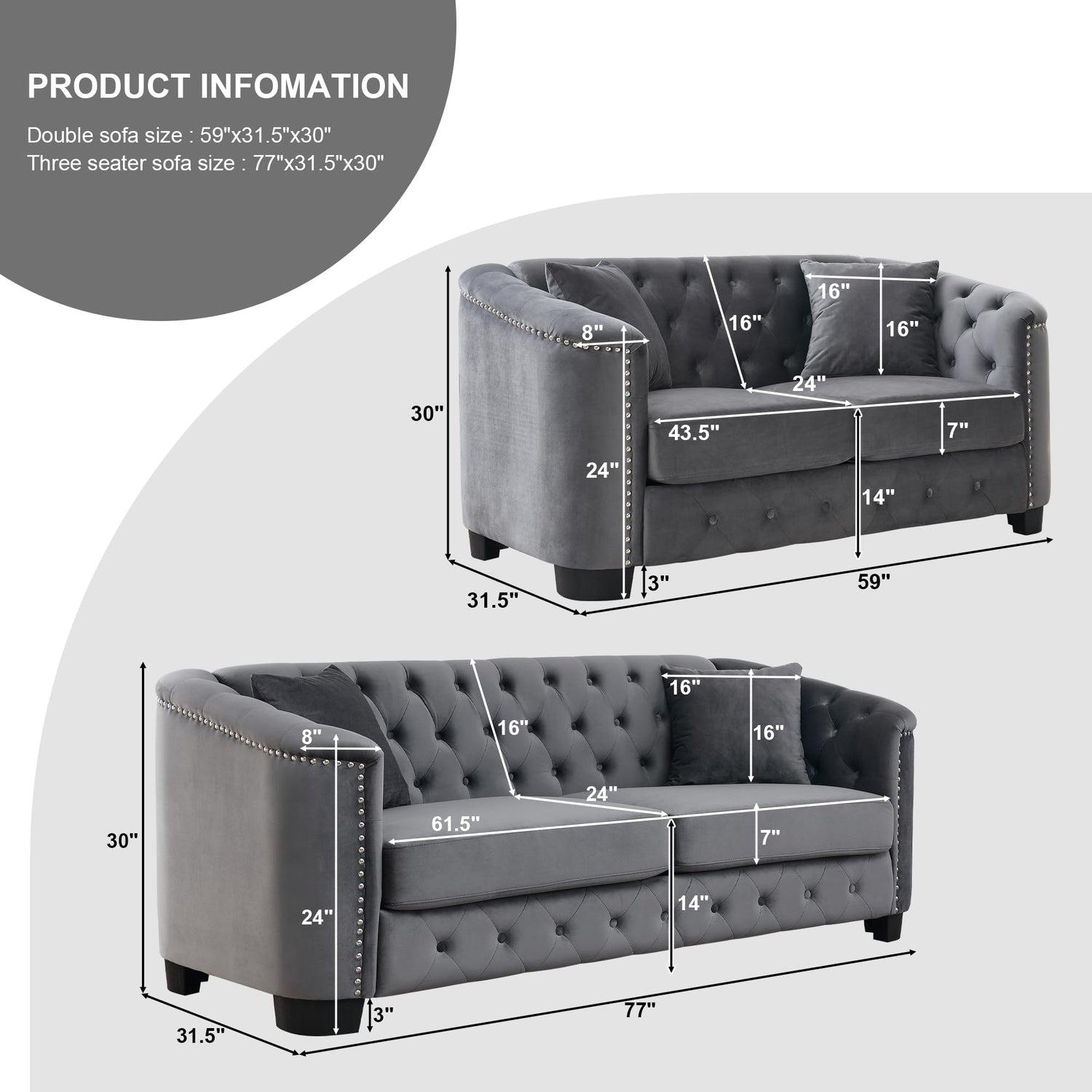 BUIORD 2 Piece Modern Chesterfield Velvet 77" 3-Seater+59" Loveseat Sofa Set, Upholstered Tufted Backrests with Nailhead Arms and 4 Cushions for Living Room, Bedroom, Apartment Grey