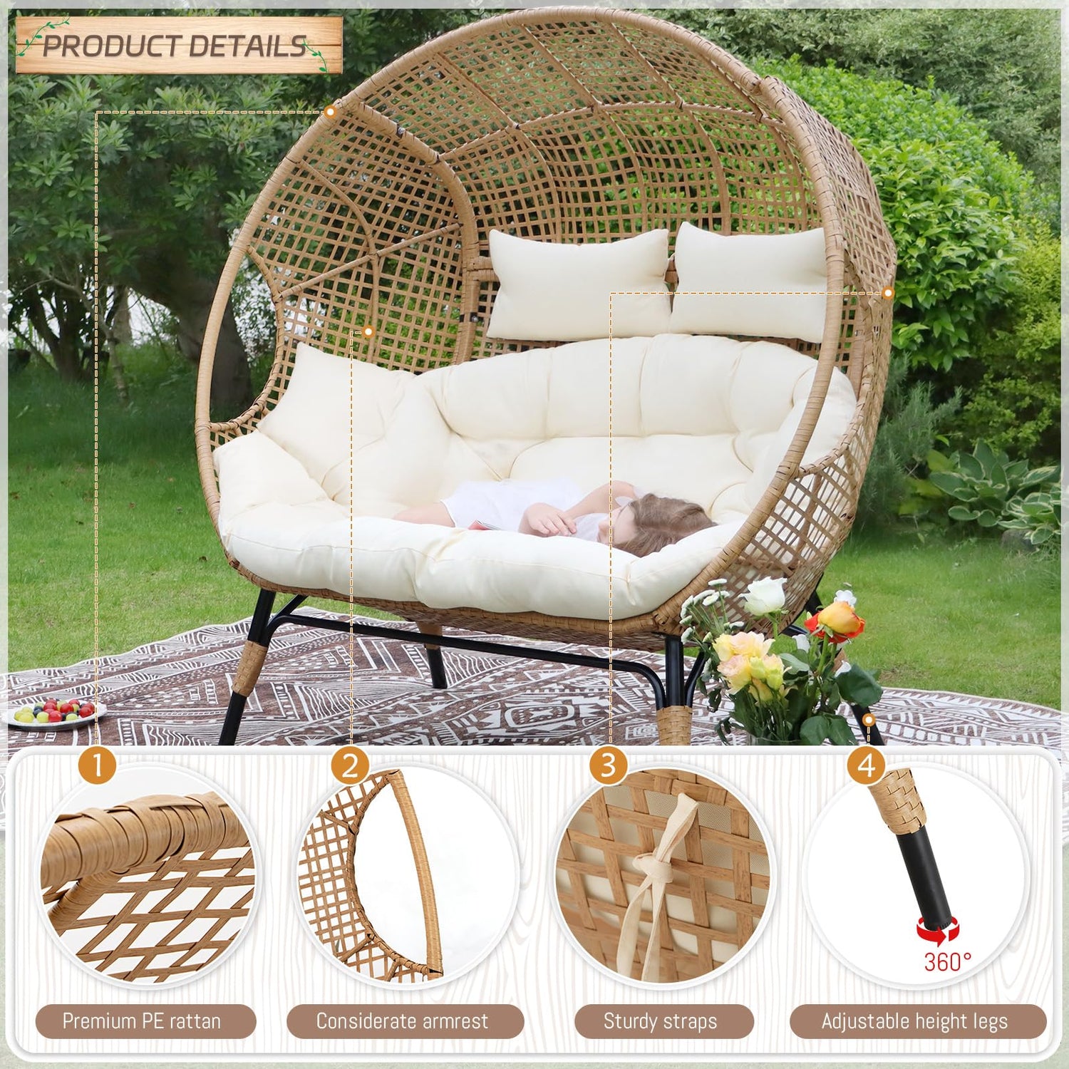BULEXYARD Double Egg Chair Indoor Outdoor 680lbs, 2 Person Brown Wicker Oversized Stationary Egg Chair with Beige Thick Cushion, Patio Wide Lounge Loveseat with Legs for Balcony, Porch