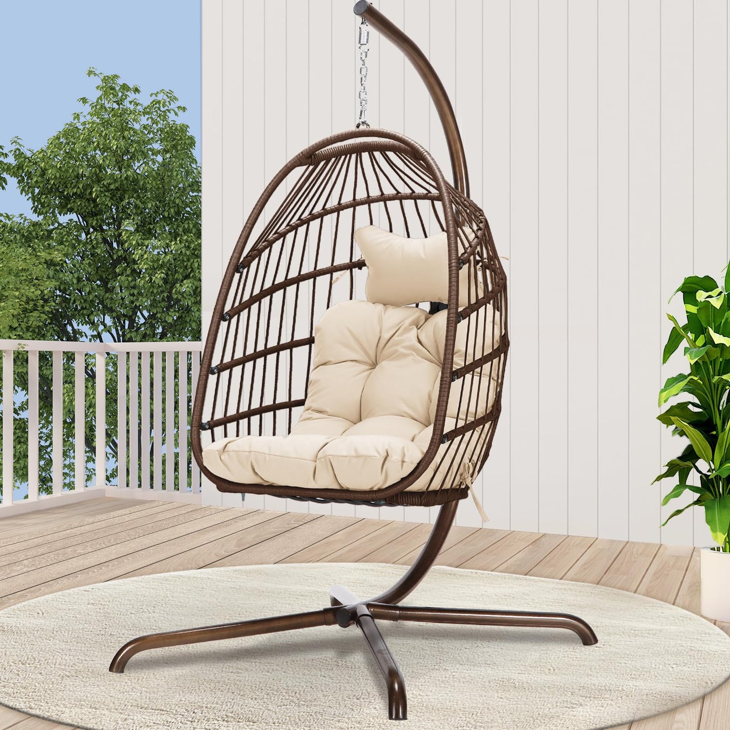 BULEXYARD Hanging Egg Swing Chair with Stand Indoor Outdoor 350lbs Capacity, Brown Wicker Hammock Egg Basket Chair with Beige Thickened Cushion for Bedroom Balcony Garden Porch Patio