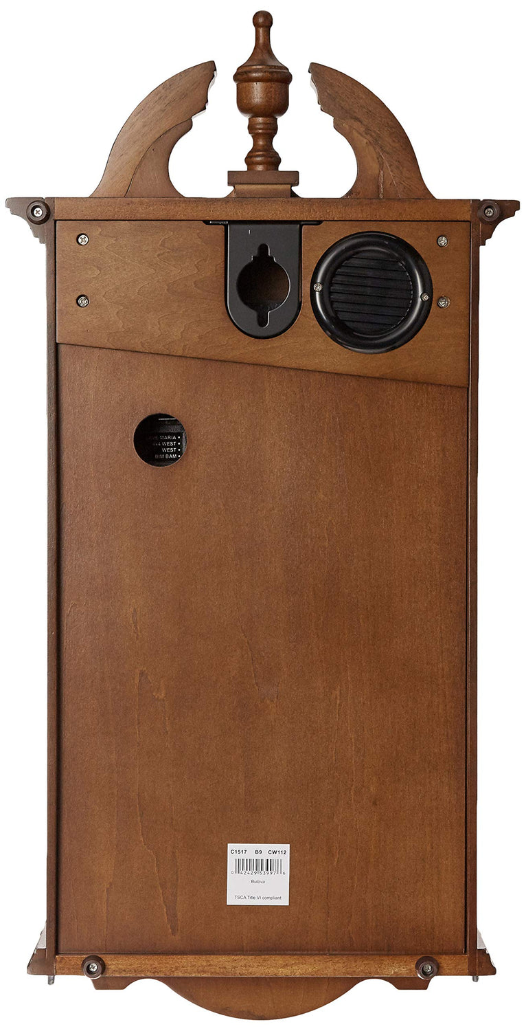 Details: Hardwood case, warm Brown Cherry finish. Classic split Pediment design with full crown returns. Vienna-style metal dial with Arabic numerals and full lyre pendulum. Harmonic 2 triple-chime movement plays choice of Westminster, AVE Maria or bim-bam Melody on the hour. 4/4 quarter-hour Westminster Chime and strike available. Adjustable volume control. Automatic night shut-off switch available. Requires (1) AA, (2) C batteries, not included.