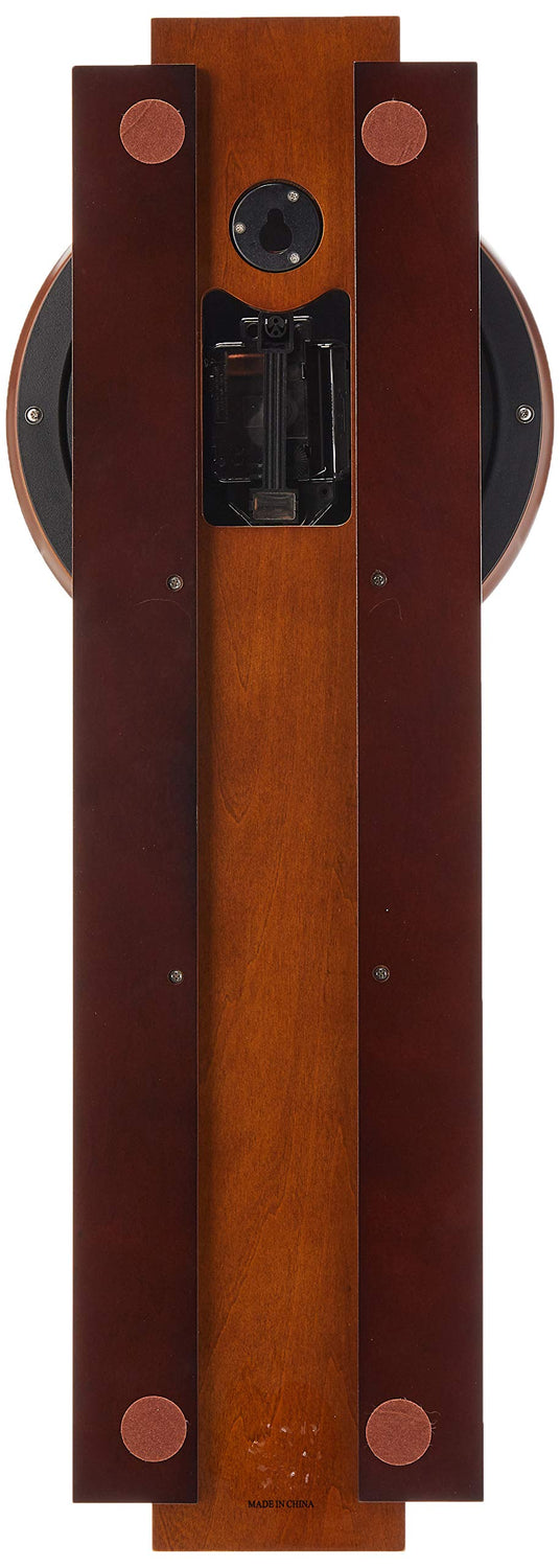Details: Wooden case, two-tone walnut and mahogany finish. Off-white dial with stylized Arabic numerals. Brushed aluminum pendulum. Protective convex glass lens. Requires (2) AA batteries, not included.