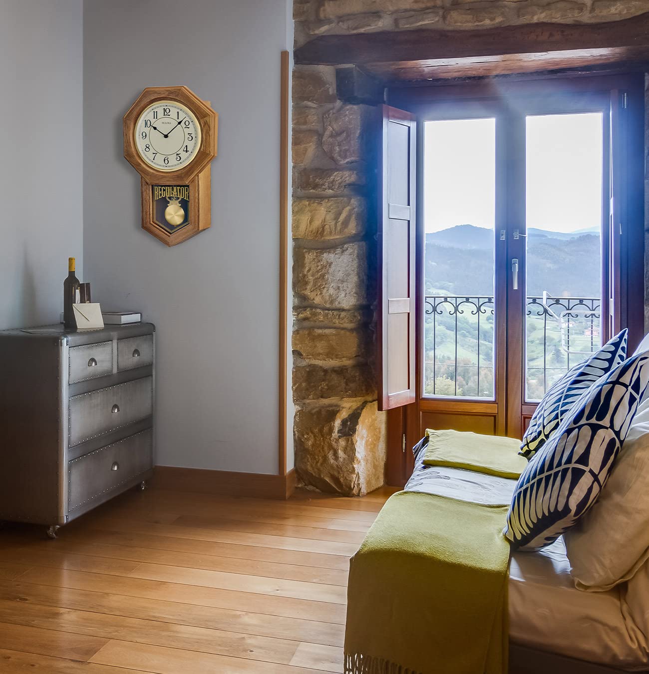 - Traditional Design: The timeless design includes raised gold finished bezel. a traditional swinging pendulum and Arabic numerals, making it a perfect centerpiece for any decor.