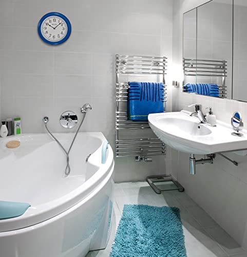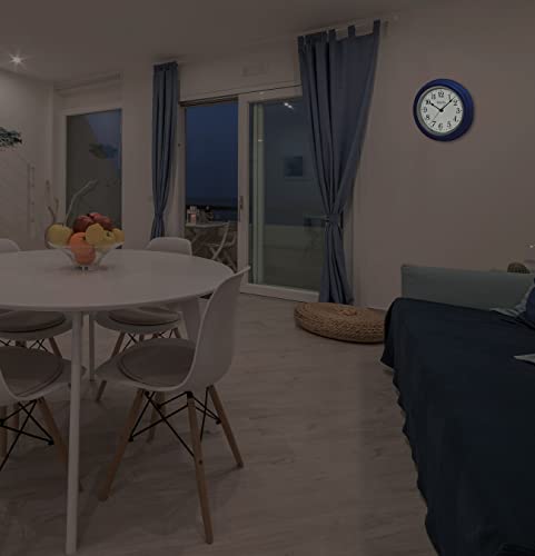 Details: A fully backlit dial and traditional easy to read numbers make this a perfect kitchen or bath clock, the molded case is finished in today’s popular blue with a matte silver inside accent bezel. A Silent sweep seconds hand (no ticking) effortlessly moves around the dial which is protected by a glass lens. The fully illuminated back dial turns on and off automatically depending on the amount of light in the room. If preferred the lighted dial can be turned off completely. Clock uses 1 AA battery, and 3 AA batteries power the back light, not included.