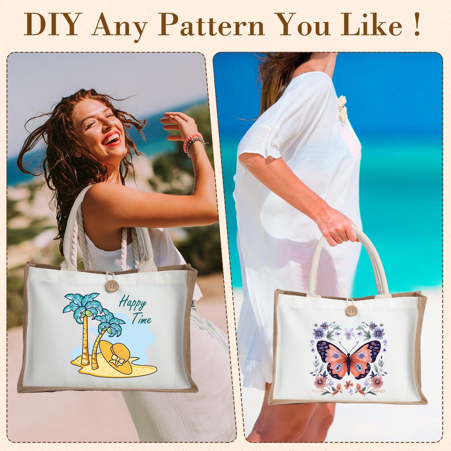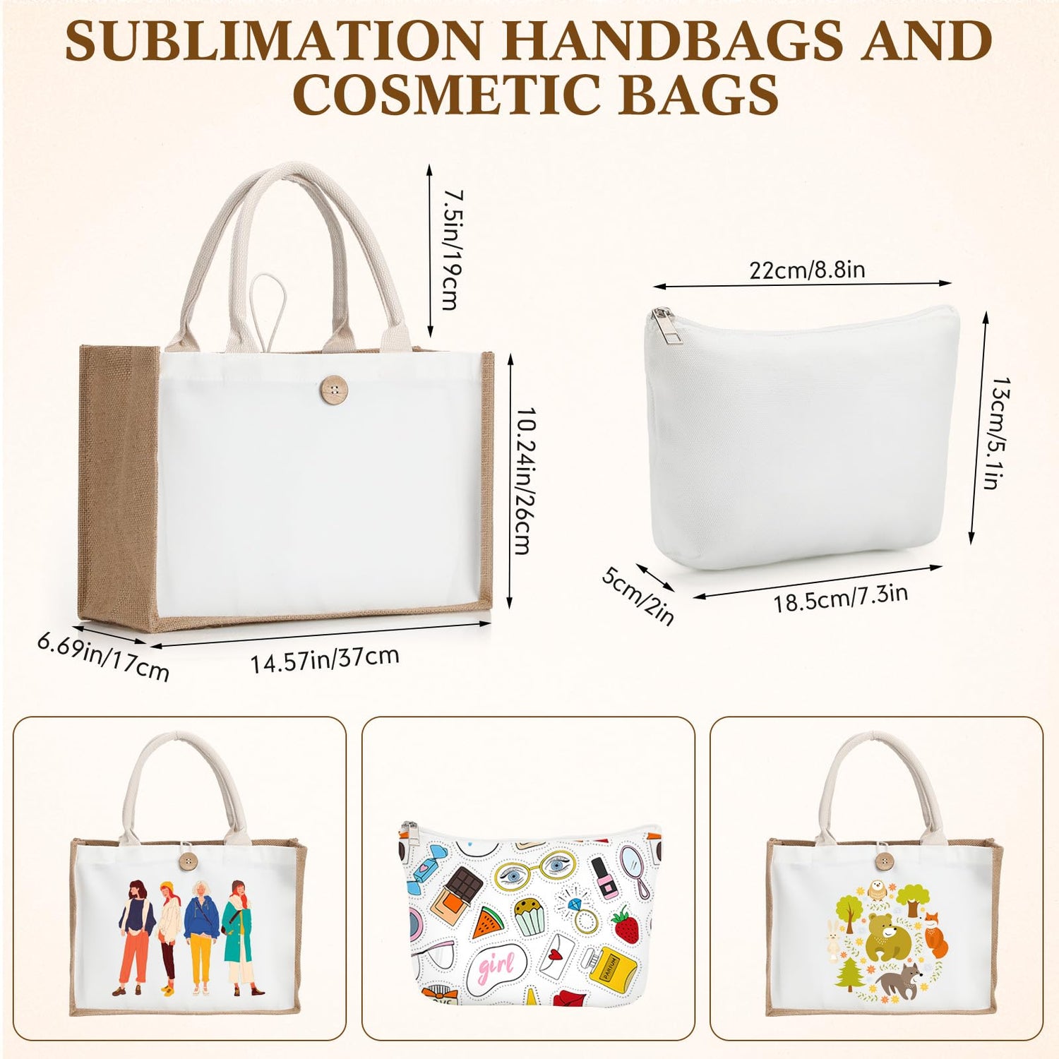 - Quantity Size: you will get 12 sublimable bags, including 6 jute tote bags with handles and buttons and 6 cosmetic bags, the size of the tote bags is about 14.57 x 10.24 x 6.69 inches/37 x 26 x 17 cm, the size of the cosmetic bag is about 7.3 x 5.1 x 2 inches/18.5 x 13 x5 cm; The quantity is enough to meet your daily needs, and the capacity of the tote bags is also large enough to hold your daily necessities, you can use or share with friends and family