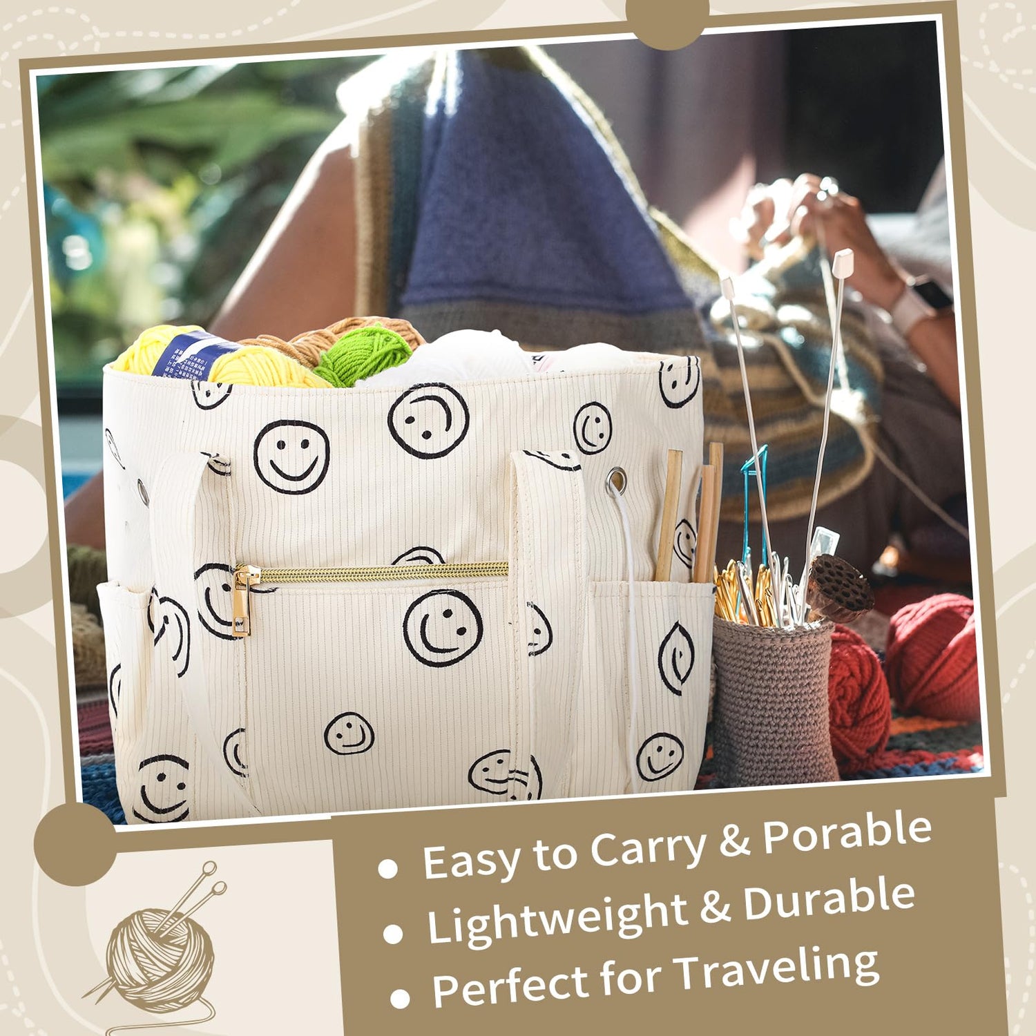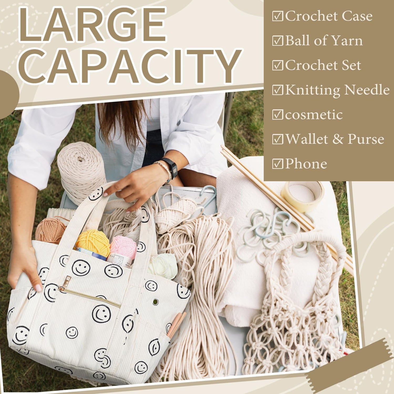 Bulyoou 2 Pcs Crochet Bag and Tote Set Corduroy Yarn Crochet Tote Bag for Hooks Organizer Smile Face Design Yarn Holder for Mother's Day Gift Lovers Knitting Accessories