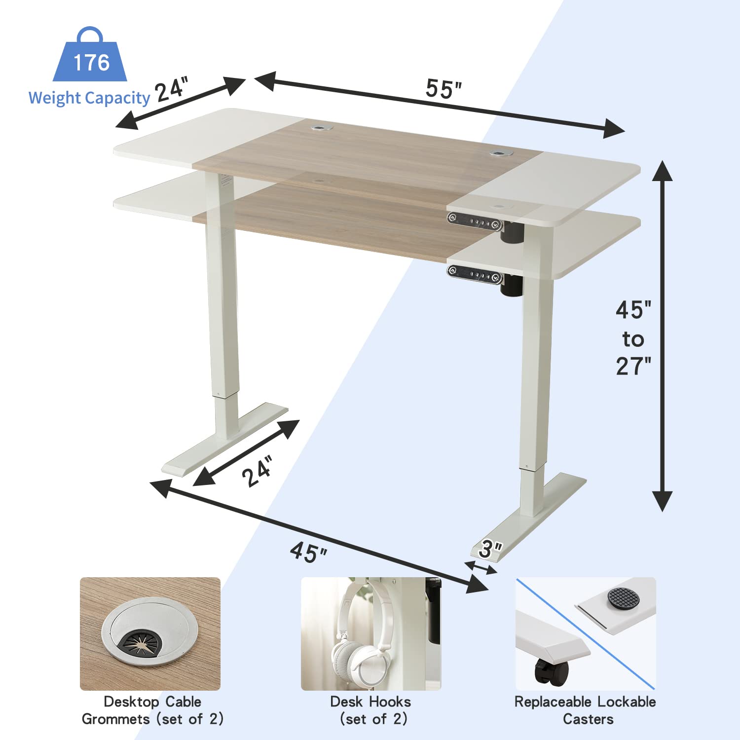 BUNOEM Height Adjustable Electric Standing Desk, 55X24 Height Stand Up Computer Desk,Sit and Stand Home Office Desk with Splice Board (White+Oak Top, White Frame)