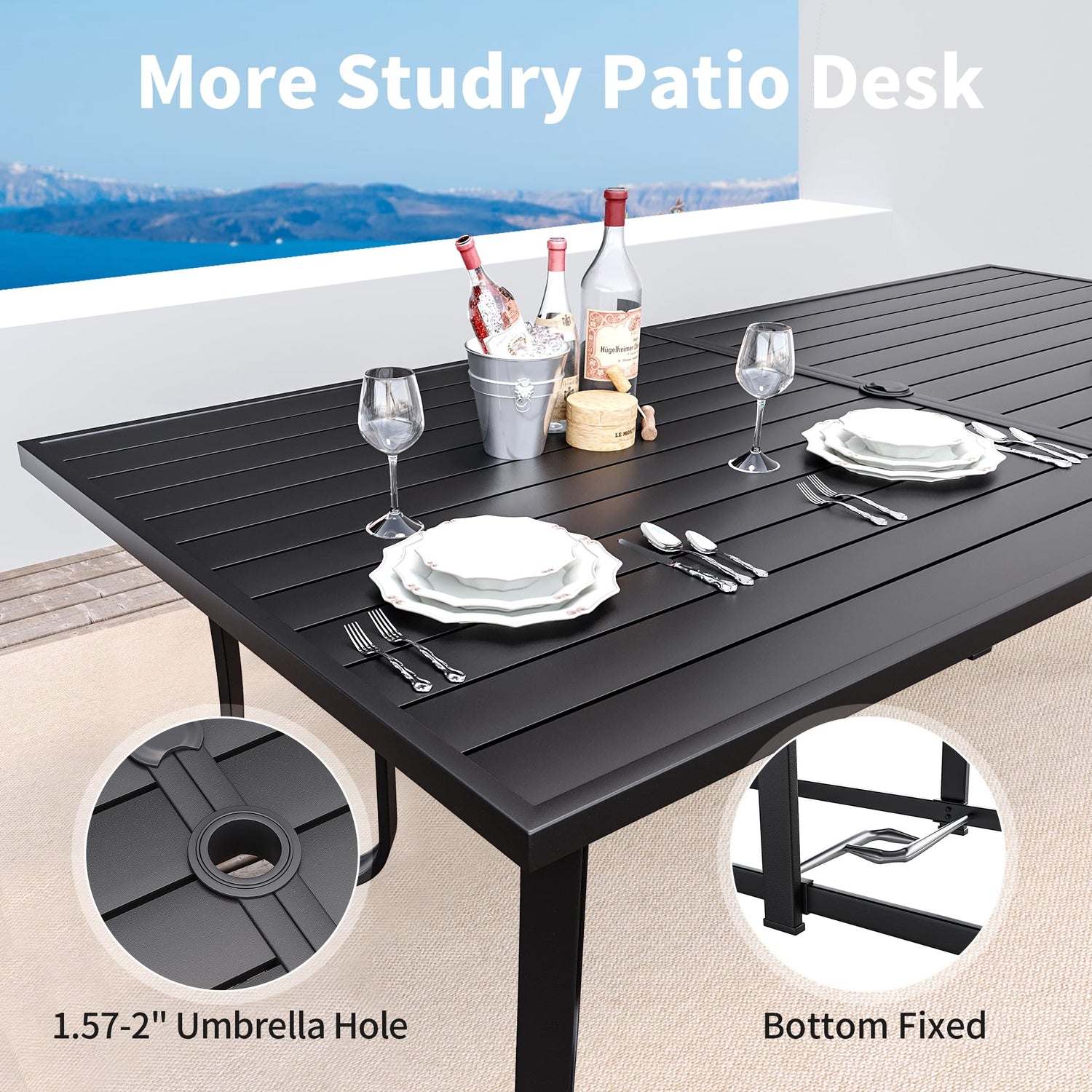 - Patio Table with Umbrella Hole: Unlike traditional glass tables, this table features a low-maintenance steel surface with a smooth, textured finish for enhanced safety. The built-in umbrella hole accommodates standard outdoor umbrellas (up to 2" in diameter), providing shade and protection for your meals and guests. Table dimensions: 75.59”L x 35.83”W x 29.53”H.