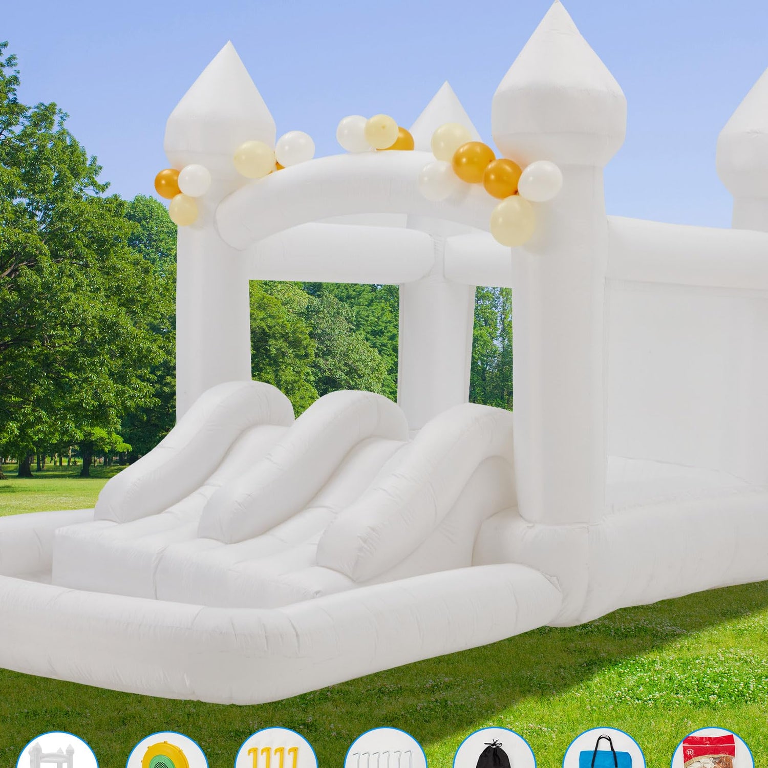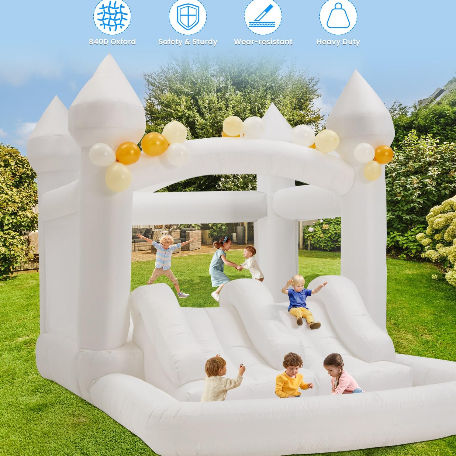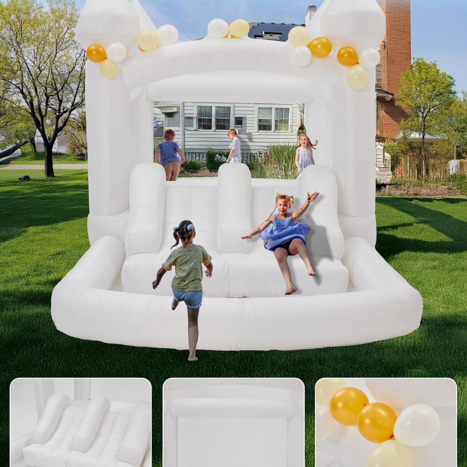 BUPPLEE Inflatable White Bounce House Jumping Castle with 480W Air Blower, 13x8x8FT Large Indoor Outdoor Bouncy Castle Theme for Kid and Adult with Slide & Ball Pit Perfect for Parties Events All Ages