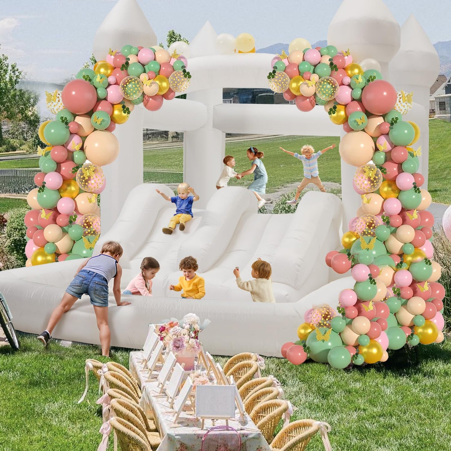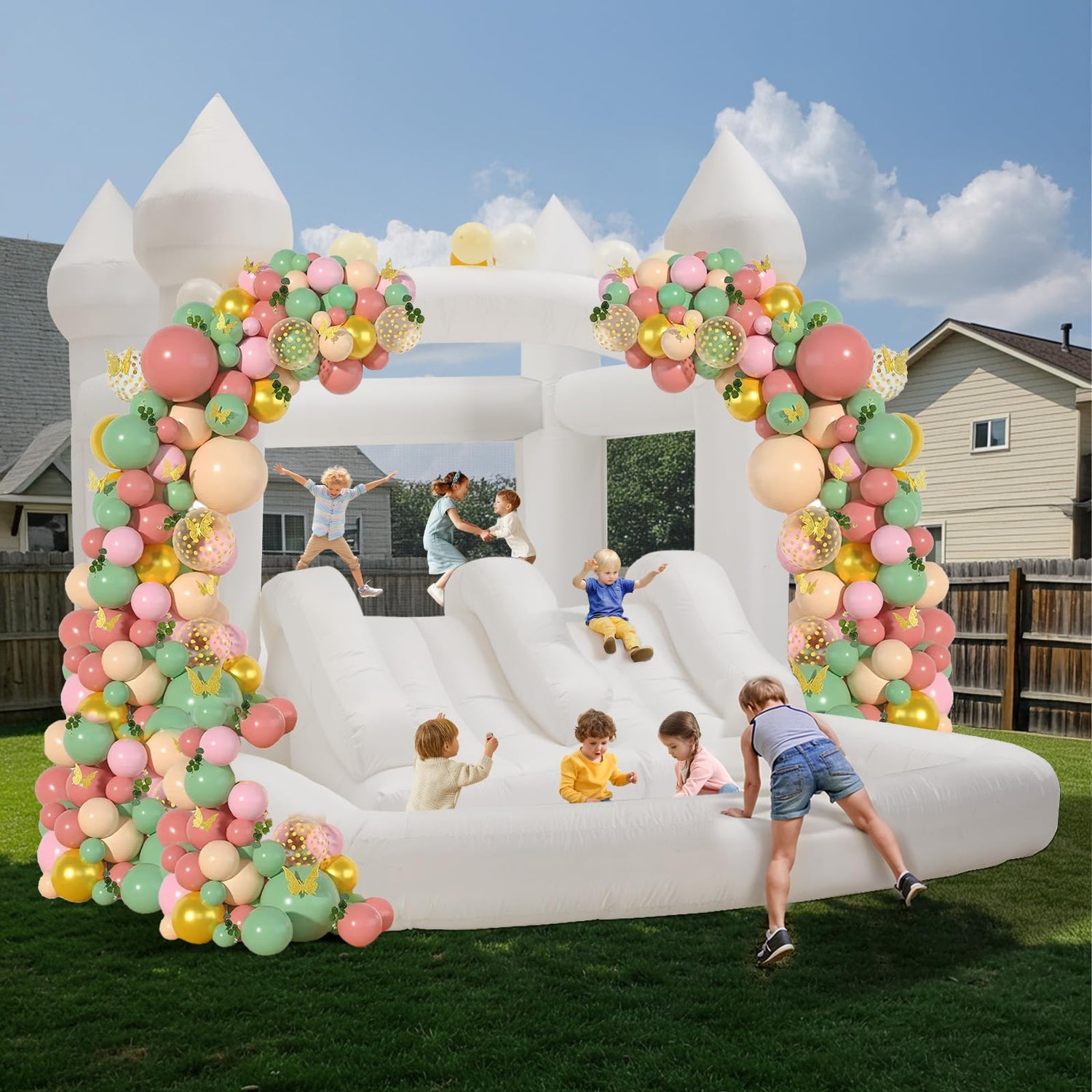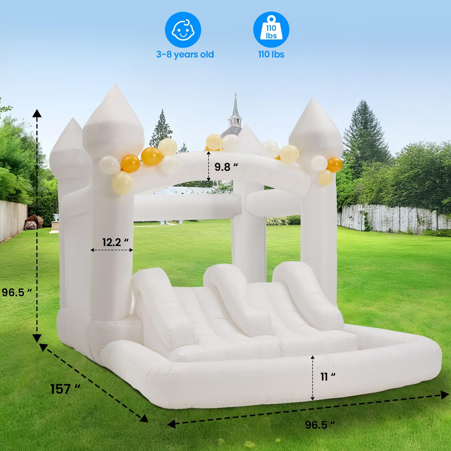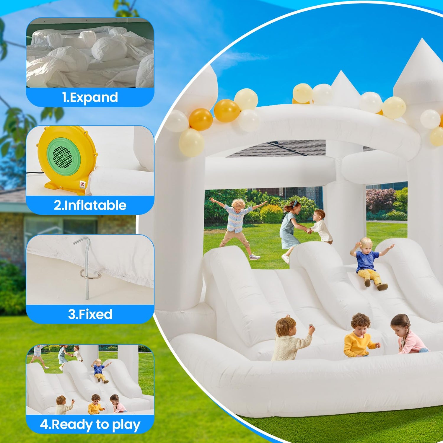 BUPPLEE Inflatable White Bounce House Jumping Castle with 480W Air Blower, 13x8x8FT Large Indoor Outdoor Bouncy Castle Theme for Kid and Adult with Slide & Ball Pit Perfect for Parties Events All Ages