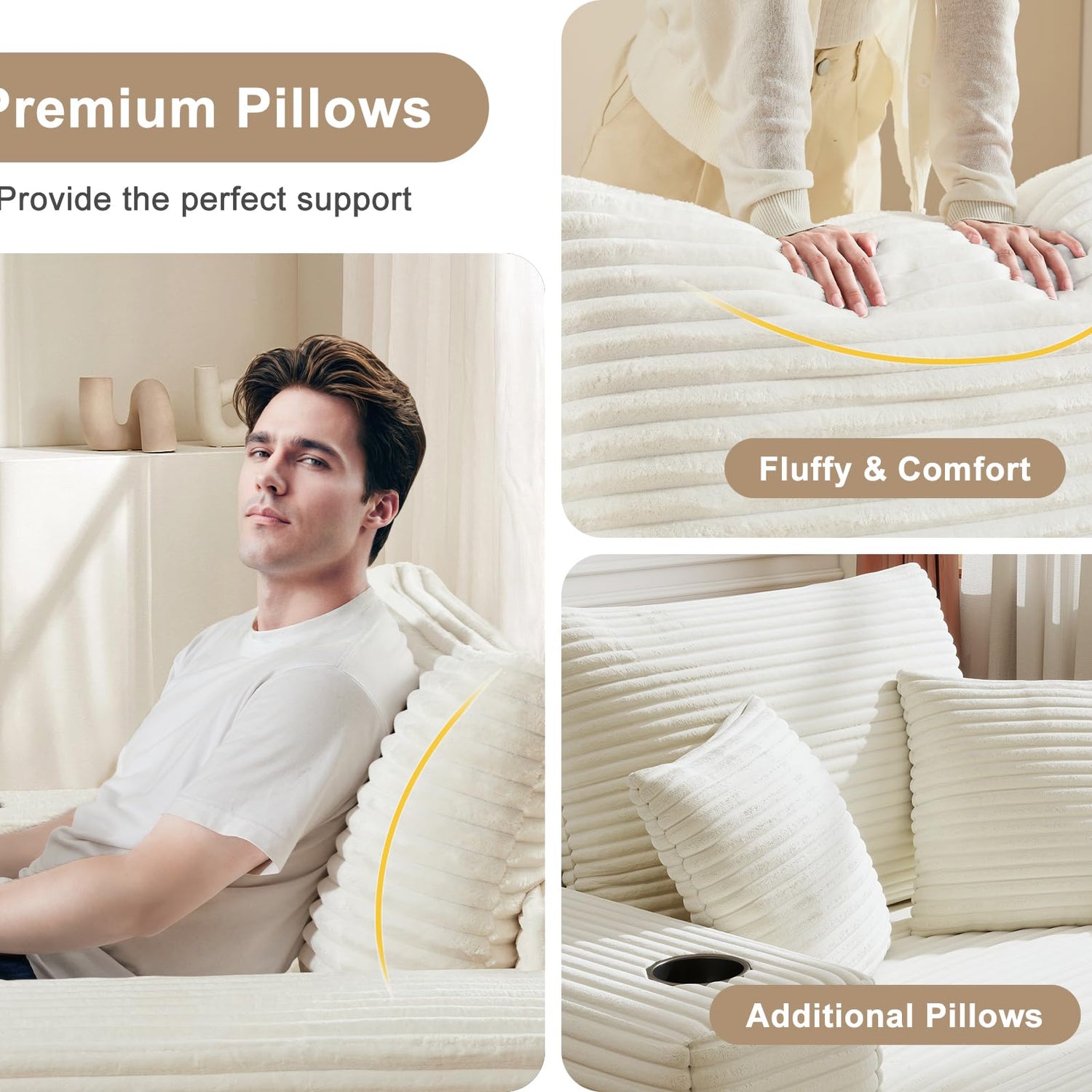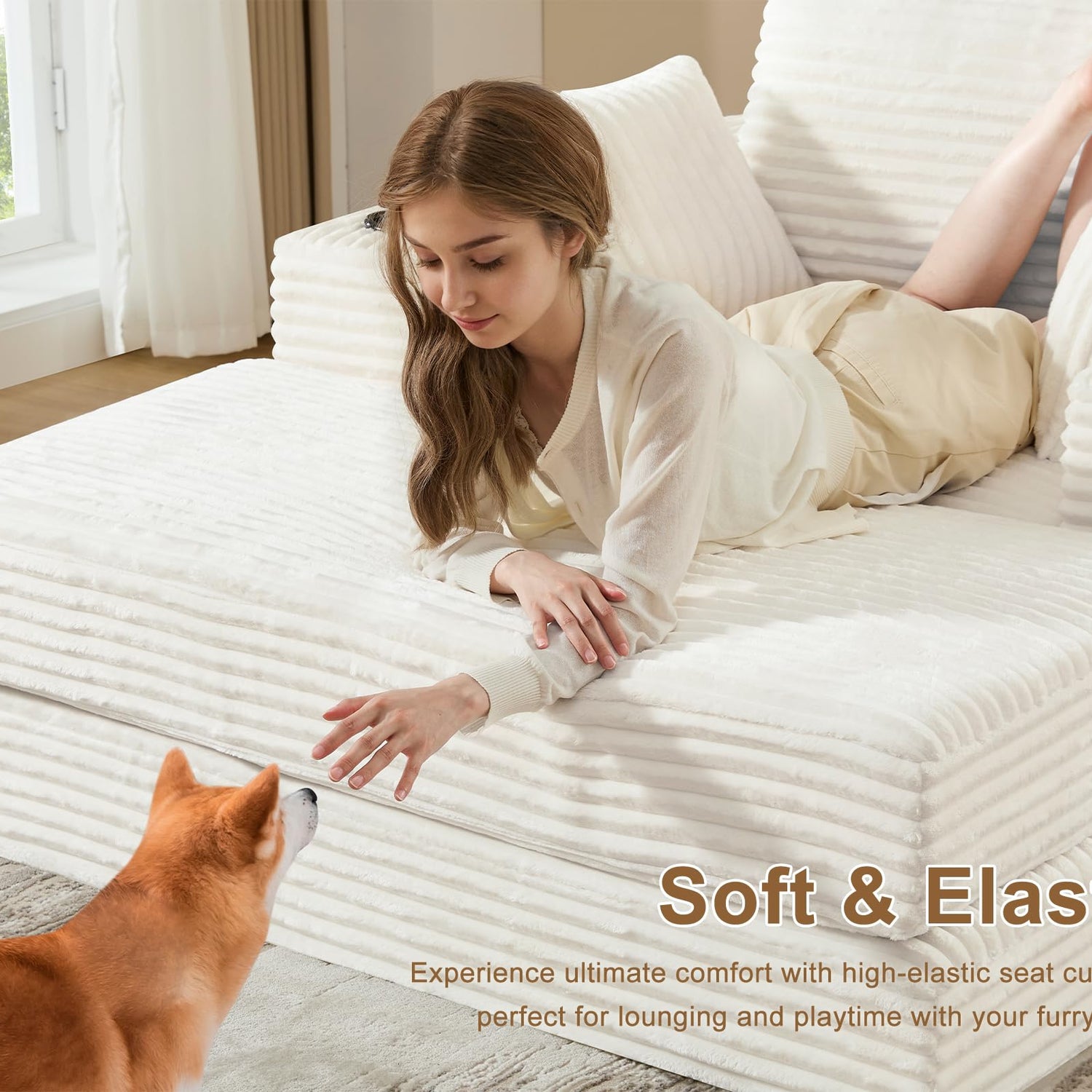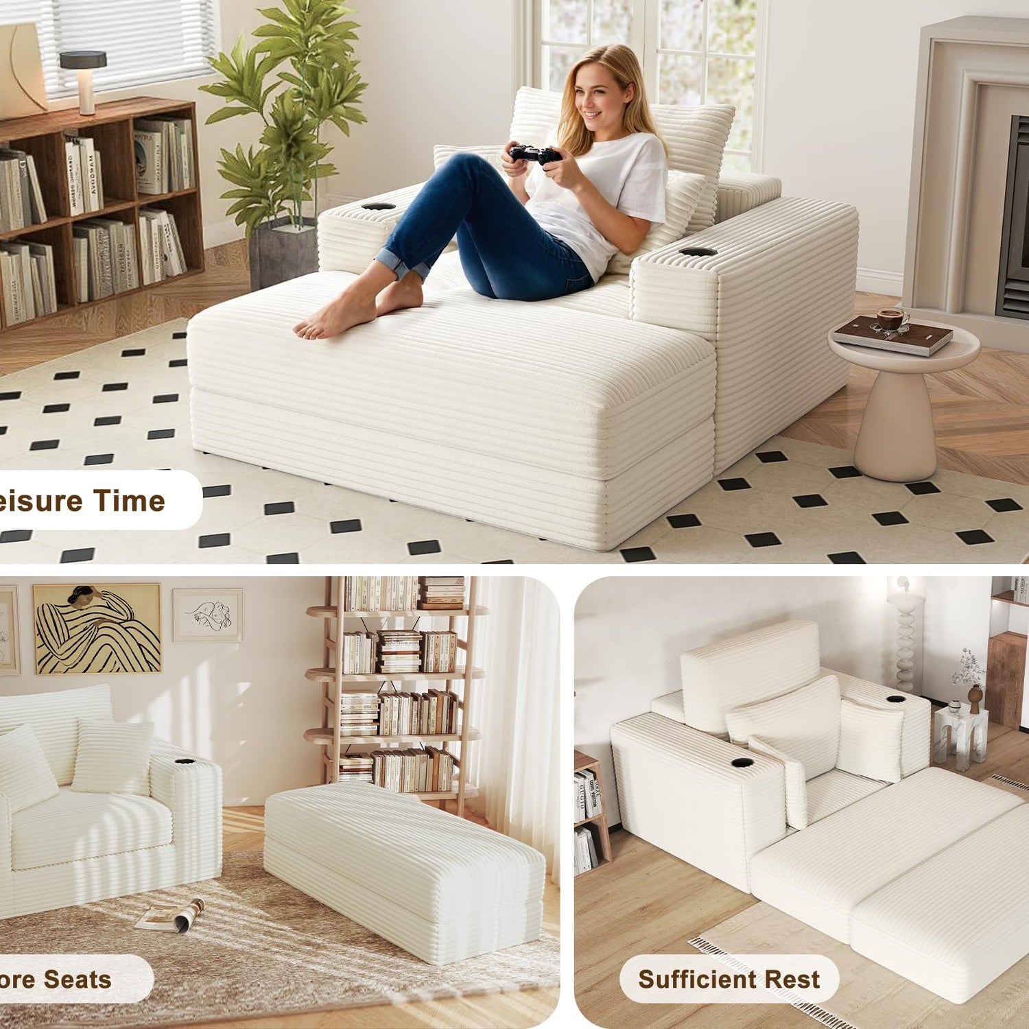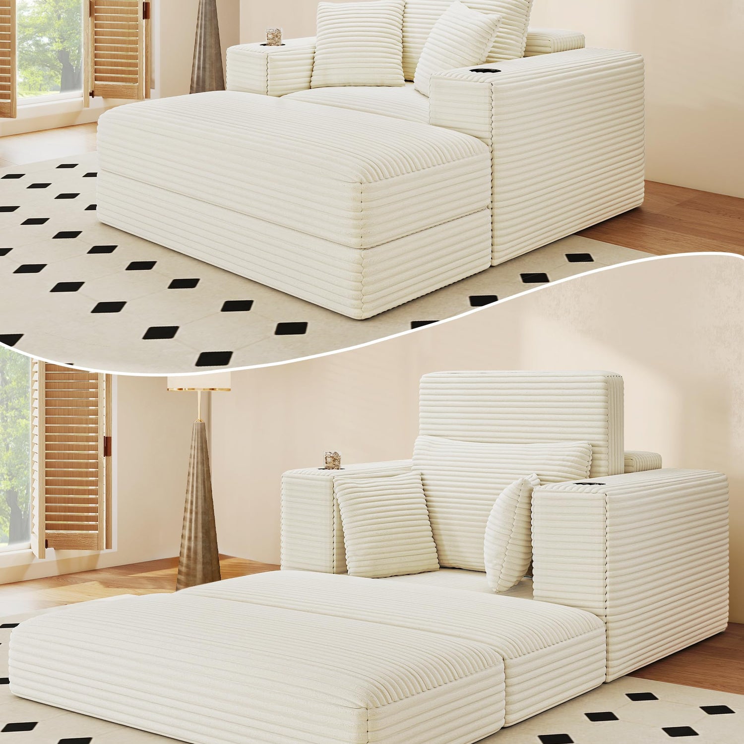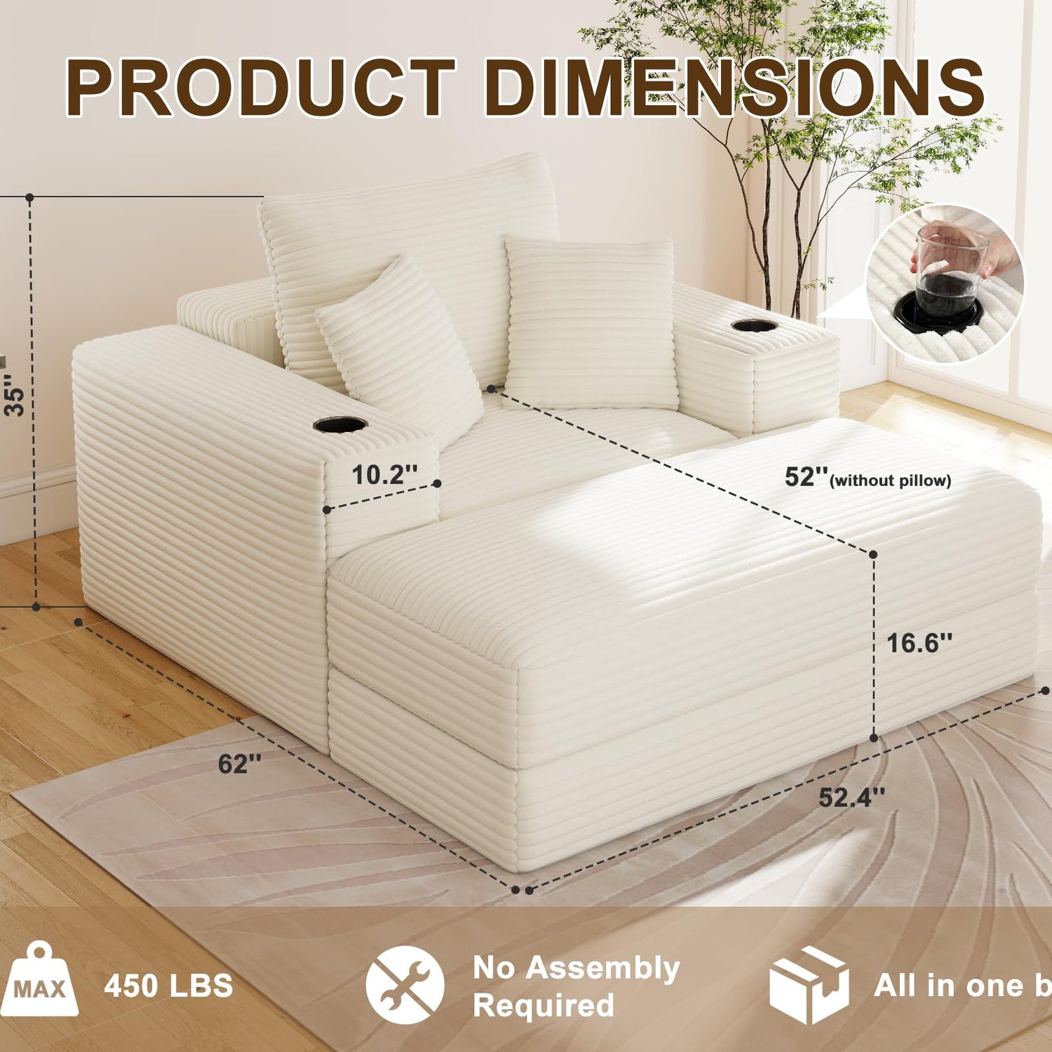 Busaurus 62" Oversized Chaise Lounge Chair Indoor, Fluffy Corduroy Upholstered Boneless Couch, Convertible Sleeper Sofa Bed & Reading Chair, Cloud Sofa Couches for Living Room, No Assembly, Beige