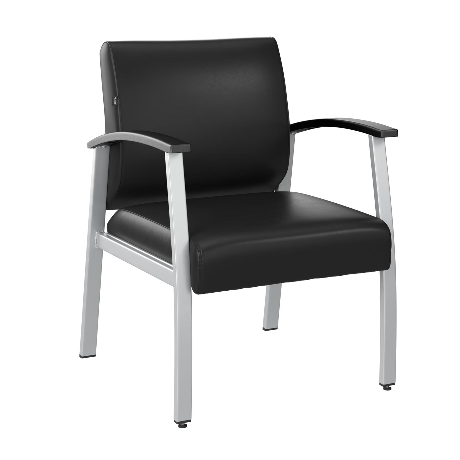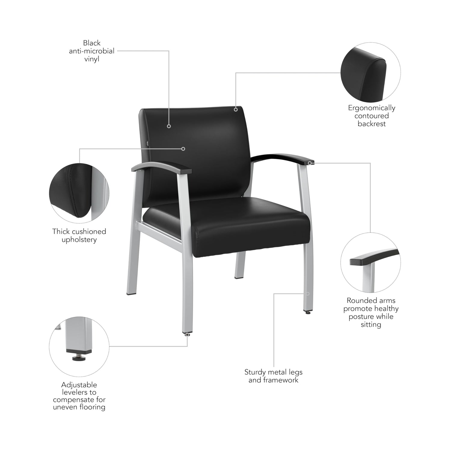 Details: The Bush Business Furniture Arrive Guest Chair with Arms is perfect for treating your visitors to a reception area that's stylish, practical, and comfortable. Highlighted by its commercial quality build and thick cushioned upholstery, this durable waiting room chair is right at home in a commercial workplace, doctor's office, hospital, school, salon, or any other high-use common area. An ergonomically contoured backrest and rounded arms are designed to reduce stress and discomfort by promoting good posture. Sturdy metal legs and framework allow the reception chair to support up to 275 pounds, and levelers are included to compensate for uneven flooring. The padded seat is quick and easy to clean and resists cuts and tears while conveying a modern professional appearance. This office guest chair has been meticulously tested to meet or exceed ANSI/BIFMA quality standards for safety, durability, and performance and is backed by the Bush Business Furniture 5 Year Manufacturer's Warranty. Complete your organization's waiting room furniture set with the Arrive Bariatric Guest Chair, Loveseat, Reception Desk and more (coordinating items sold separately).
