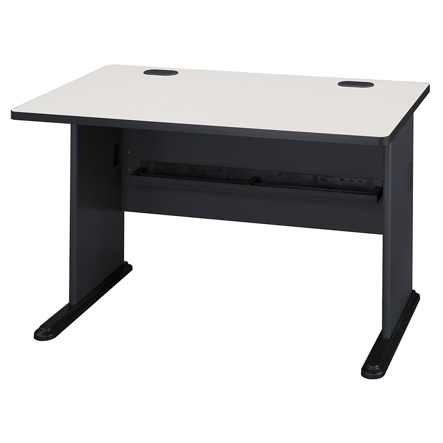 Details: The Bush Business Furniture Series A 48W Desk provides lasting comfort and durability in a compact package. Perfect for a small office or as part of a larger workspace, the commercial-grade Desk features an open C-Leg design to maximize legroom. Thick end panels resist damage, while a thermally fused laminate surface fends off scratches and stains for a long-lasting professional appearance. Wire management grommets organize and secure computer cables to keep them out of your way. Sturdy Desk feet include encapsulated steel armature and adjustable levelers for use on all types of flooring. Series A completes your multi-person workspace, classroom, home office or anywhere in between with a variety of configuration options. Featuring multiple two-tone finishes and contemporary styling, this commercial office furniture adapts to your surroundings. Customize any environment with a full line of affordable products, all backed by a 10 Year Warranty. Series A withstands the rigors of a 40-plus hour week and meets ANSI/BIFMA quality test standards. American made with U.S. and imported parts.