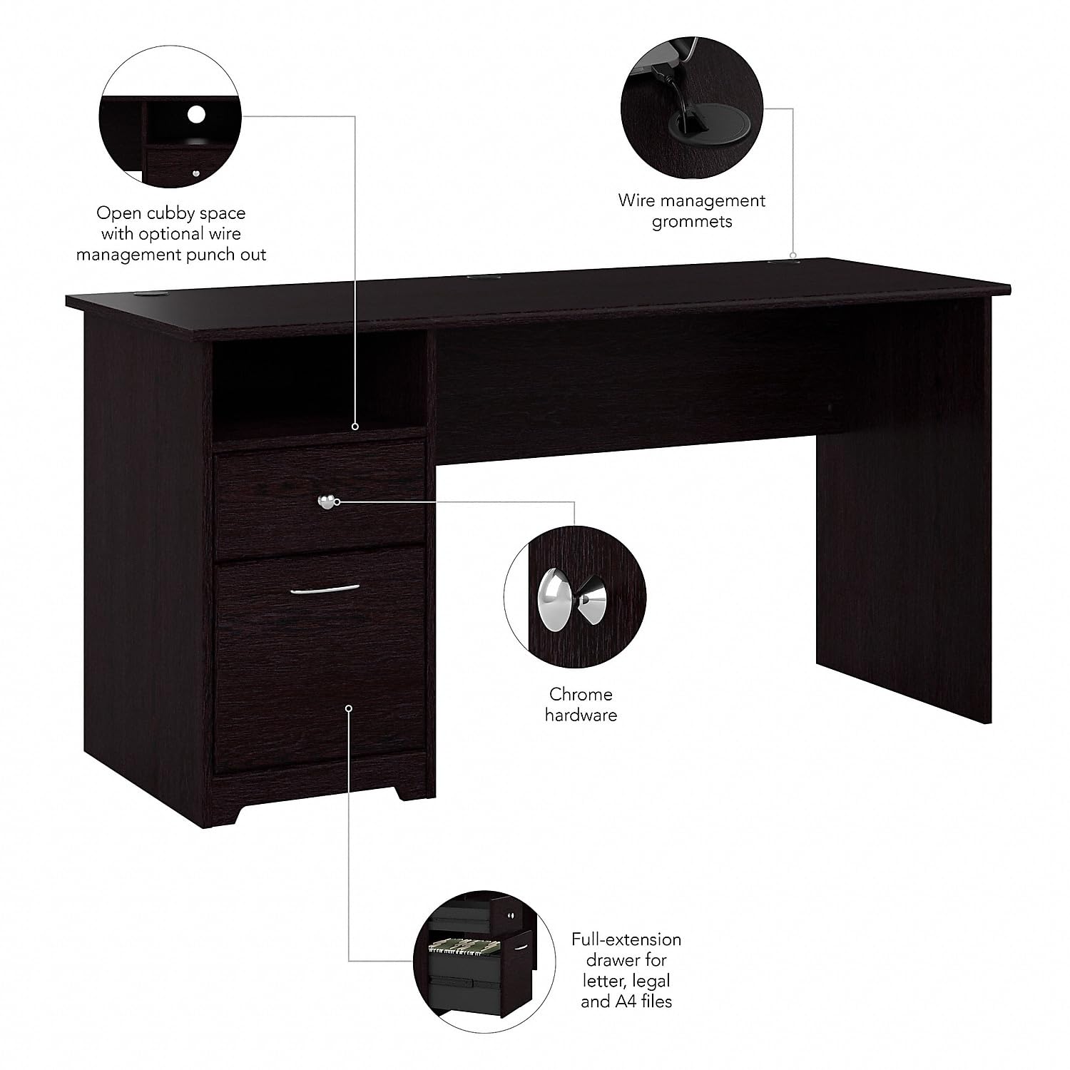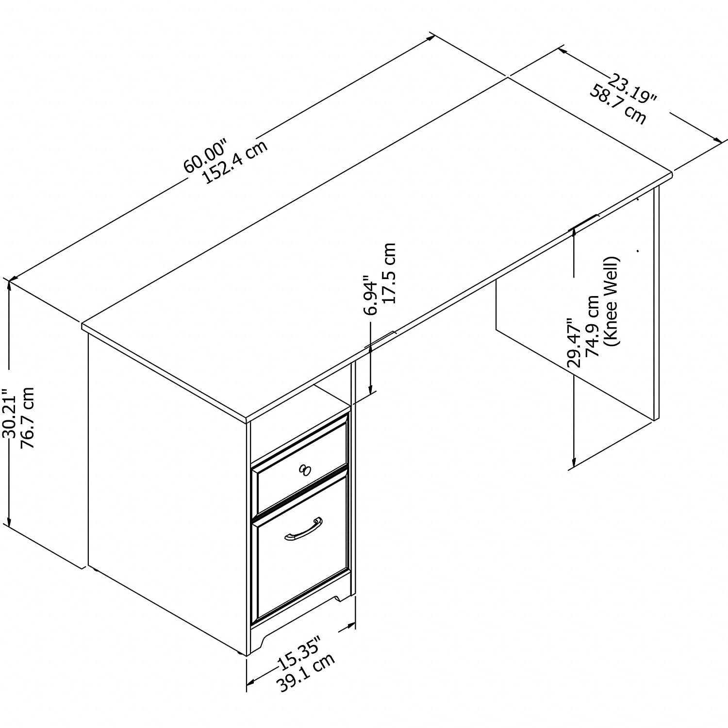 Details: The Bush Furniture Cabot 60W Computer Desk with Drawers presents a home office solution with transitional style. Take advantage of the 60-inch desk surface to spread out with a computer, books, and all the materials you need to power through your next project or assignment. The durable desktop supports up to 200 pounds and includes built-in wire management to keep cords and cables out of the way while you work. A single file drawer opens on smooth full-extension ball bearing slides for an effortless reach to letter, legal, and A4-size paperwork. The box drawer organizes writing utensils, notepads, and other small office supplies while the open cubby shelf is perfect for work-in-progress and frequently used materials. The large desk is finished on all sides to look great facing any direction in your home office. Stylish metal hardware complements your choice of several traditional and contemporary finish options for an appearance that works with your own space and taste. This home office desk with storage has been rigorously tested to meet or exceed ANSI/SOHO quality standards for safety and performance and is backed by the Bush Furniture 1 Year Manufacturer's Warranty. See the full Cabot Collection for coordinating items to complete your transitional workspace, including office chairs, file cabinets, bookcases, and more (sold separately).