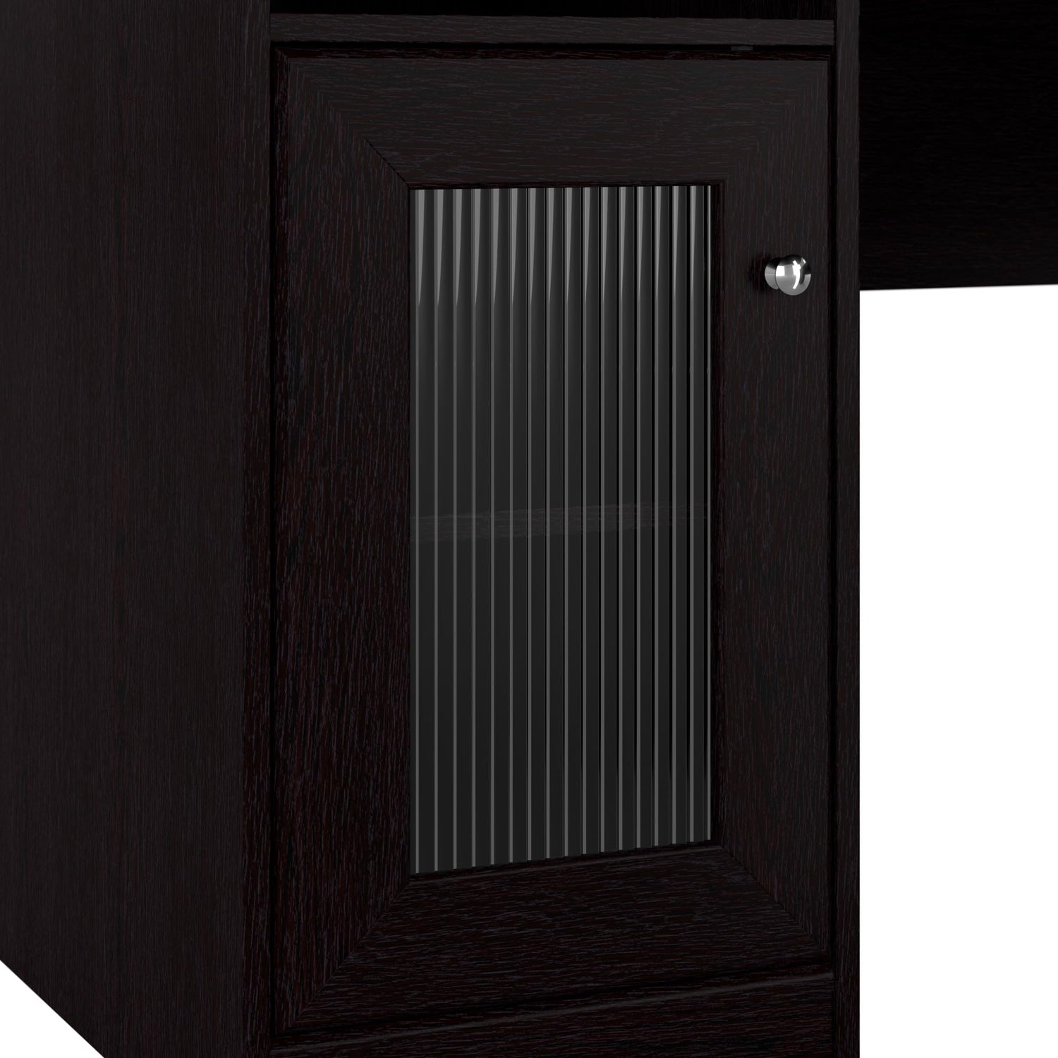 Details: The Bush Furniture Cabot L Shaped Computer Desk in Espresso Oak offers a spacious and efficient workplace for your home or office. Enjoy a beautiful traditional look with smart features for your convenience. The L Shaped Desk design provides a large durable work surface and just the right amount of storage to keep you feeling neat and organized. Desk storage details include an enclosed cabinet with stylish fluted glass door and a box drawer for supplies. A file drawer glides on smooth full-extension ball bearing slides and accommodates letter, legal or A4 sized files. Technology features such as a built-in 4-port USB hub add convenience while a soft tray in an open cubby can store electronic devices as you stay connected on your Computer Desk. Quality construction meets ANSI/BIFMA test standards for safety and performance. A rich Espresso Oak finish accented by Chrome hardware provides a simple, elegant and timeless appearance. See the full collection for coordinating items available, all backed by the Bush Furniture 1 Year Manufacturer's Warranty.Assembly is required.