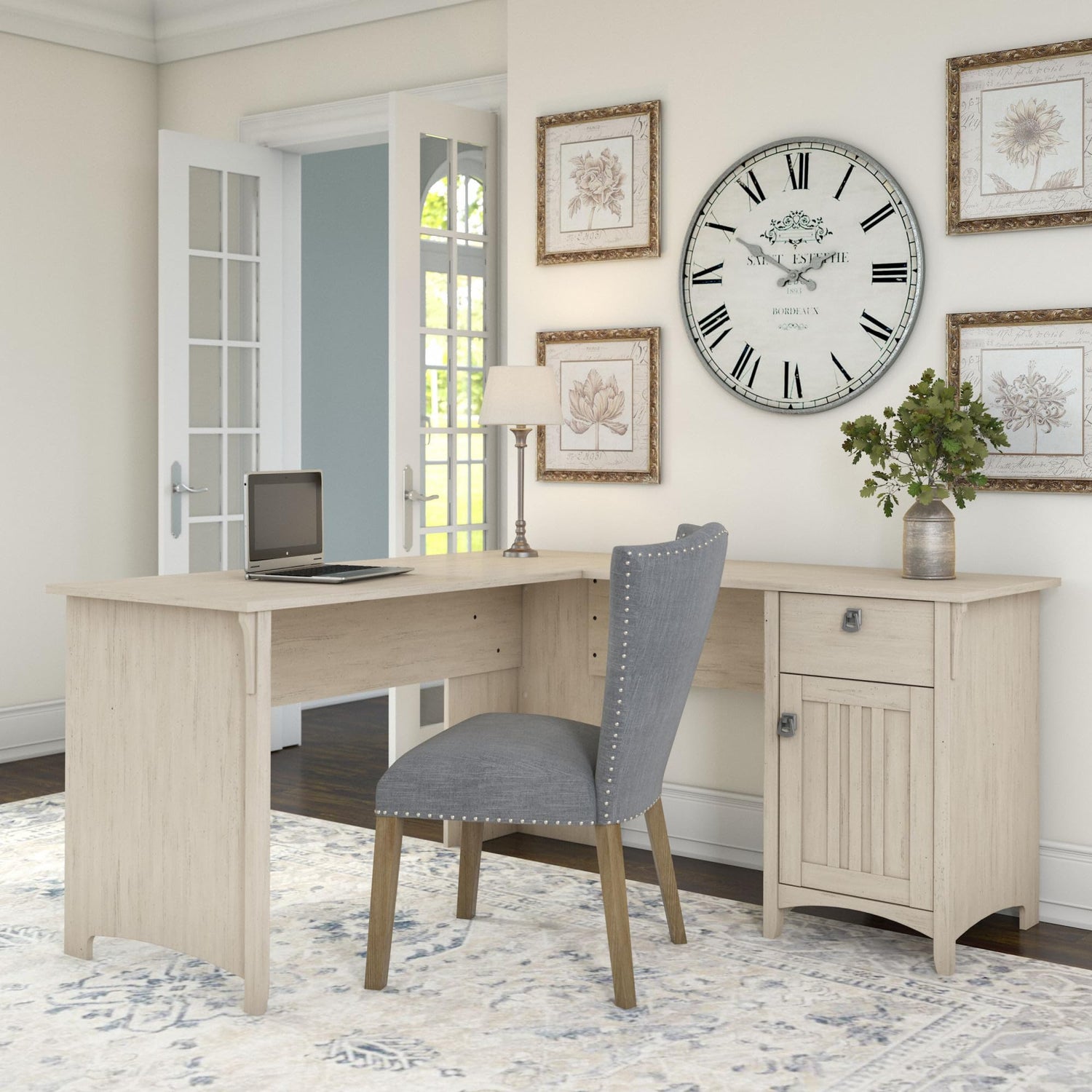 Bush Furniture Salinas L Shaped Desk with Storage in Antique White | Modern Farmhouse Corner Table with Drawers and Cabinets for Home Office