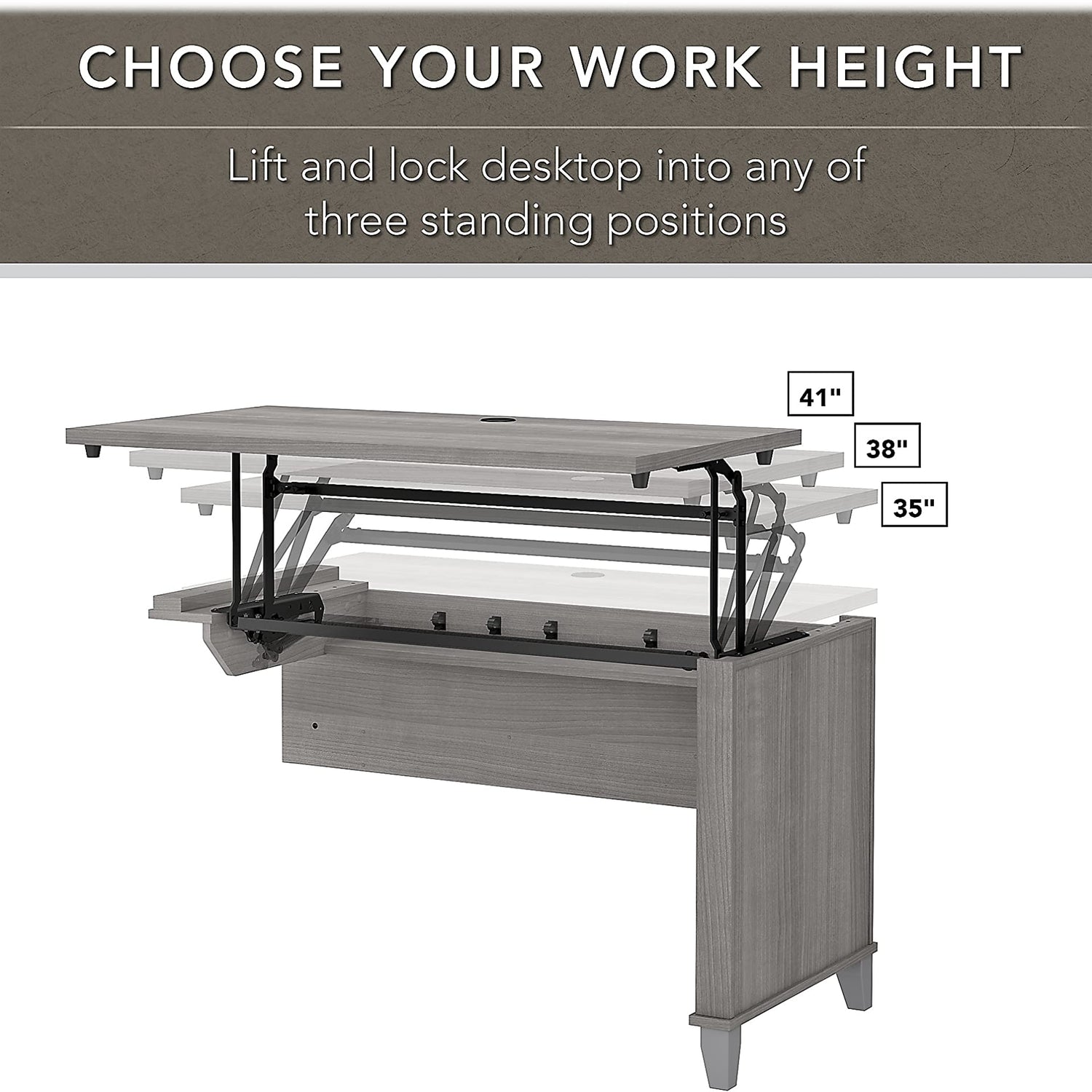 - Adjustable - The Lift-n-Lock Desktop feature allows you to adjust the height of the desktop to three standing positions (35, 38, or 41 inches) with ease, making it effortless to find the perfect ergonomic position to work in comfort.