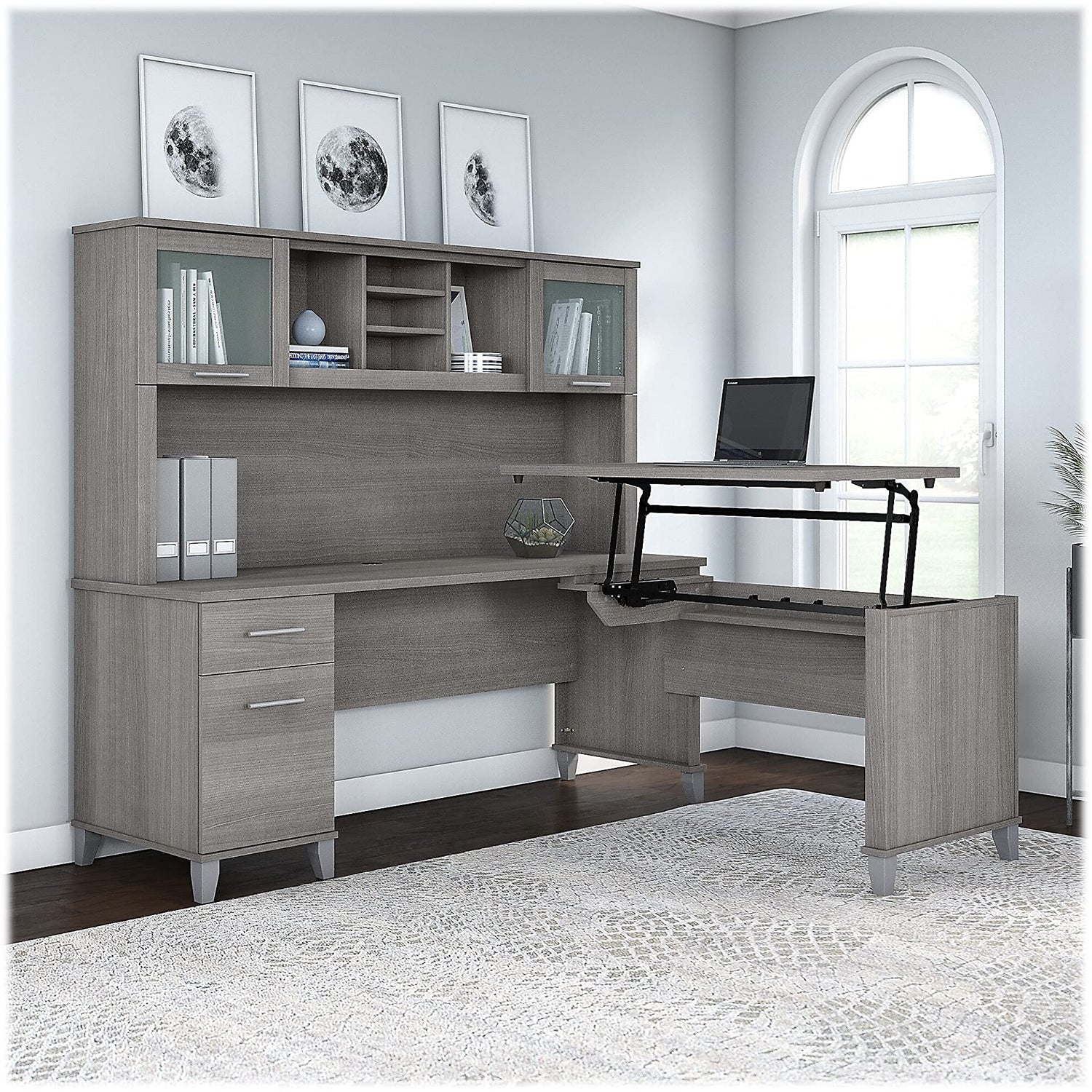 Bush Furniture Somerset 72W 3 Position Sit to Stand L Shaped Desk with Hutch in Platinum Gray