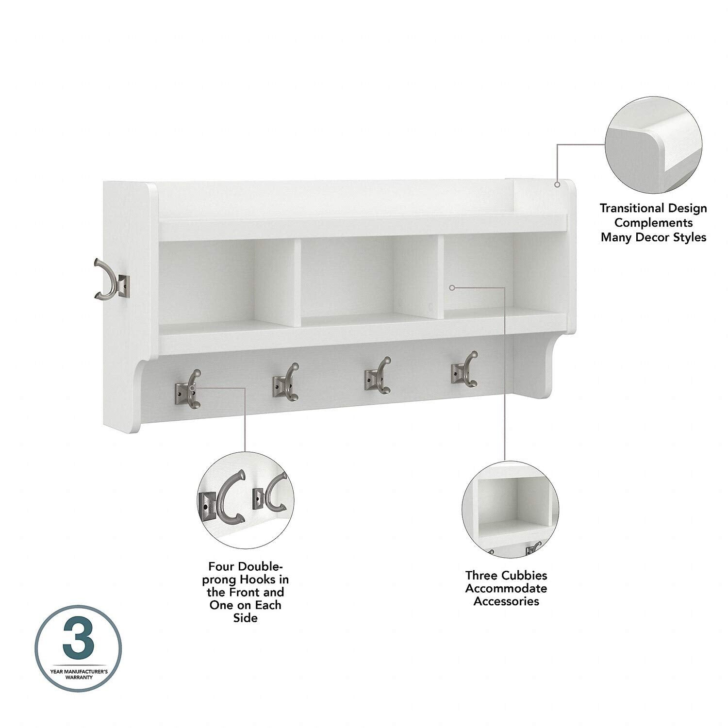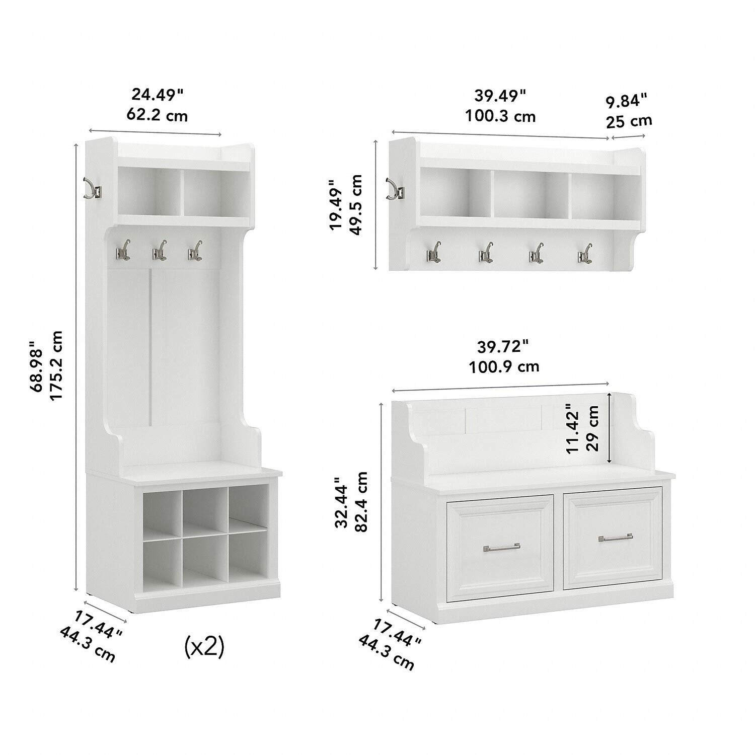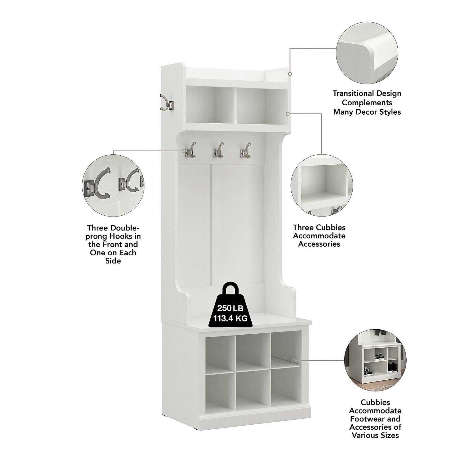 Details: The Bush Furniture Woodland Full Entryway Storage Set with Coat Rack and Shoe Bench with Doors combines transitional styling and a practical design to offer an ideal organization solution. Have a seat on the durable storage bench and take a moment to relax as you get ready to head out the door or come home after a long day. Each section of the long mudroom bench supports up to 250 pounds, so you can sit down to put on and take off your shoes or set shopping bags down after a trip to the store with confidence. Two small storage cabinets and cube shelving to the left and right accommodate footwear and accessories for a clutter-free entryway, mudroom or foyer. The narrow hall trees and wall mounted shelf include a total of 10 Weathered Nickel coat hooks in the front and one on each side for hanging jackets, hats, scarves and more. Smaller items like gloves and keys can be stashed neatly inside seven open compartments. This entryway bench and coat rack set has been tested to meet Bush Furniture's standards for safety, performance and durability and is backed by a 3 Year Manufacturer's Warranty.