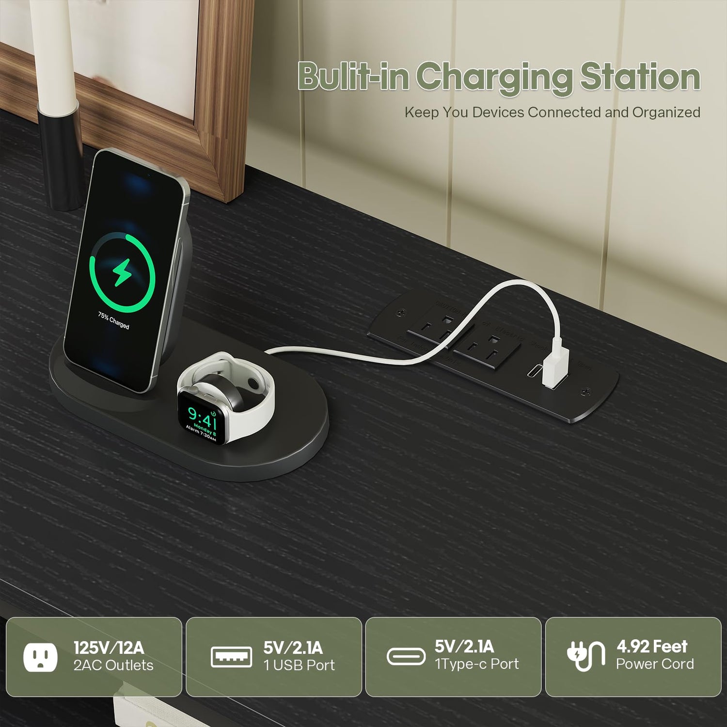 - 【Safety Power Outlet & LED Tv Light】Hidden drilling holes behind, Easy to store, say goodbye to messy wires! Equipped with 2 power outlet & 1 usb ports and 1 type-c, tv stand for living room offers convenient charging for your tv, gaming equipment, and other electrical devices. The LED light can be controlled with the app or remote, offering 60,000 colors and dynamic flashing modes to different music, The LED lights offers a nice ambiance. This tv stand dresser for bedroom is both functional and visually appealing, making it an excellent choice for anyone looking to upgrade their entertainment center