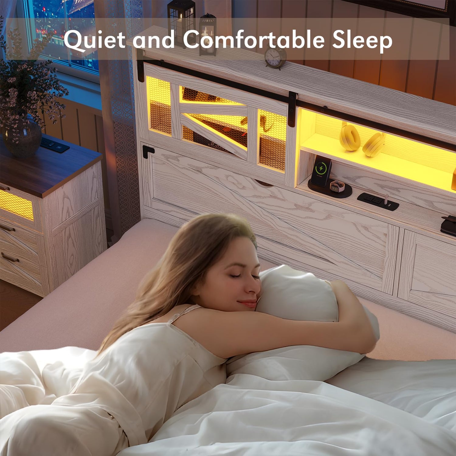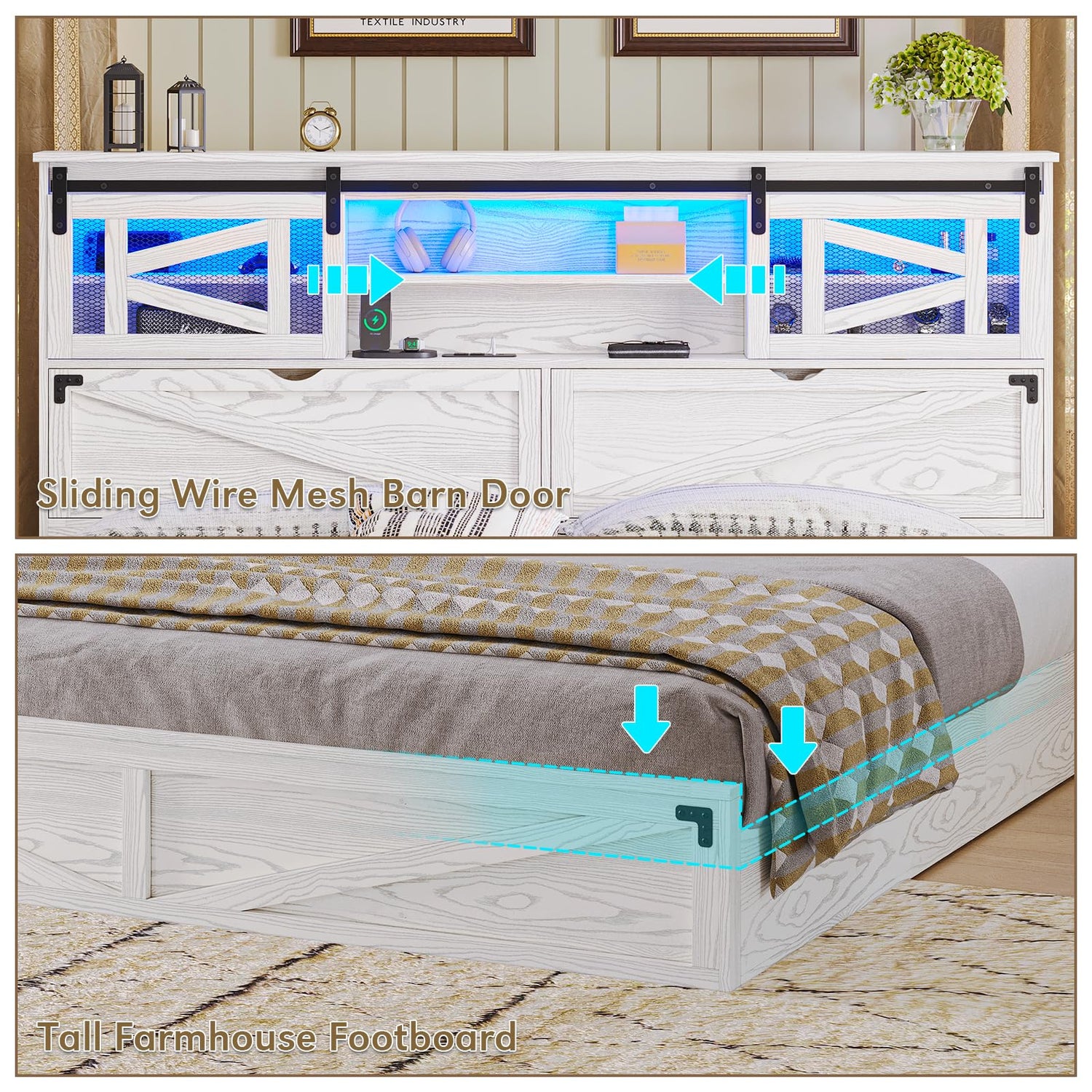 - 【Storage Headboard with Sliding Barn Door】Unique storage headboard of the farmhouse bed frame queen size offers large, versatile storage. The top of the spacious headboard can hold plants, alarm clocks, candles, decorations and more to accent your bedroom and create a warm, cozy atmosphere. Behind two sliding barn doors, two tiers of shelves store books, phones, tablets, papers, glasses and daily items for easy access. Under the headboard, two hidden storage spaces store clothes, quilts, cushions and other infrequently used items. Make the bedroom space look more spacious and neat