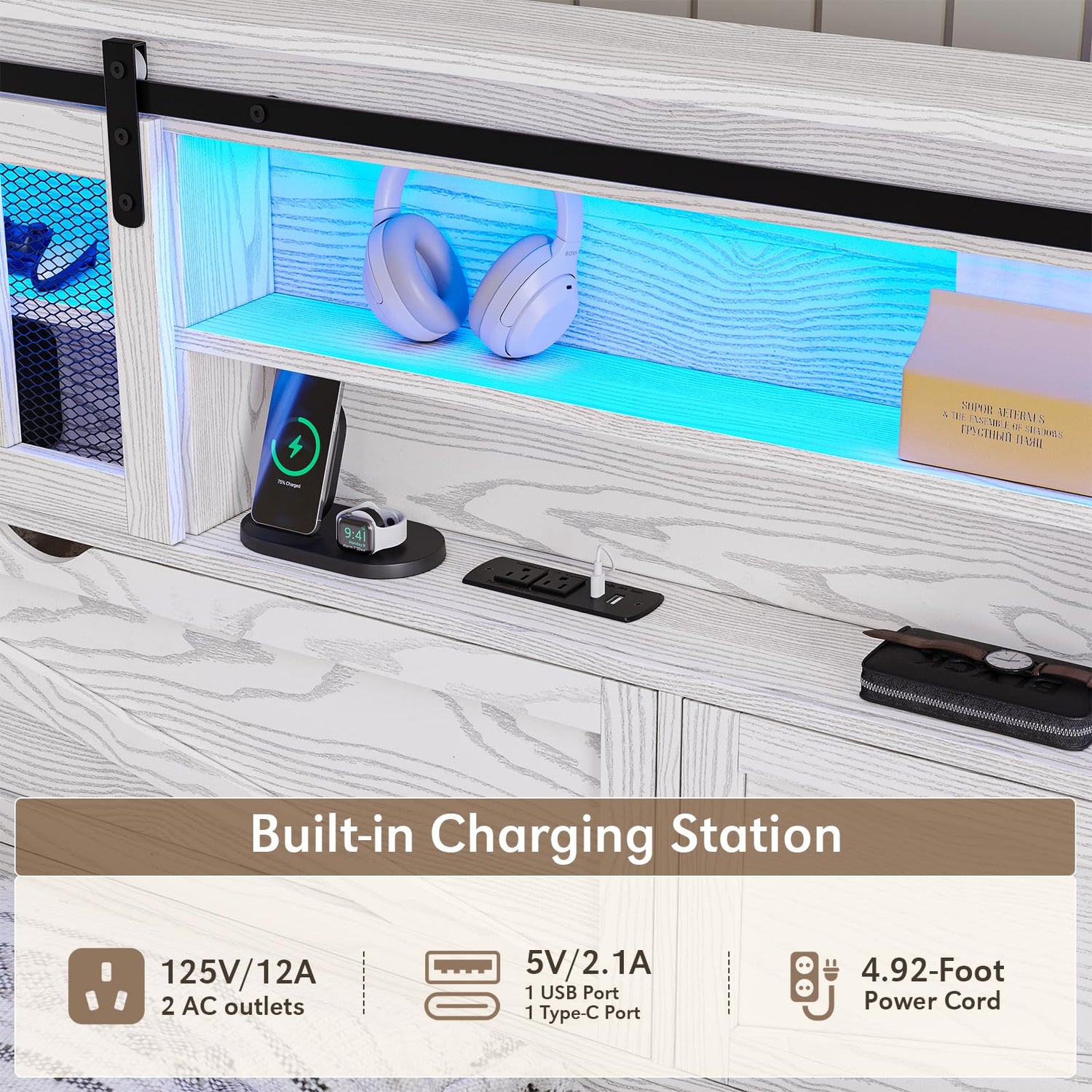 busyaeh Farmhouse Bed Frame Queen Size with Storage Bookcase Headboard, Wooden Queen Bed Frame with Charging Station & Led Light, Rustic Platform Bed Frame with Sliding Barn Door, No Box Spring Needed