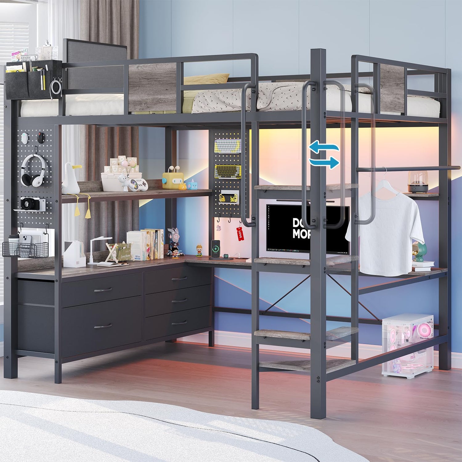 - 【Thoughtful Additional Features】Full loft bed Two pegboards are provided, which can be utilized to hang decorative items or frequently used small objects. The clothes drying rack offers convenience for drying clothes. The elevated guardrails on the loft bed full size with desk supply safety protection, and the upholstered backrest augments the comfort of reclining, thereby comprehensively augmenting the practicality and comfort of the full size loft bed