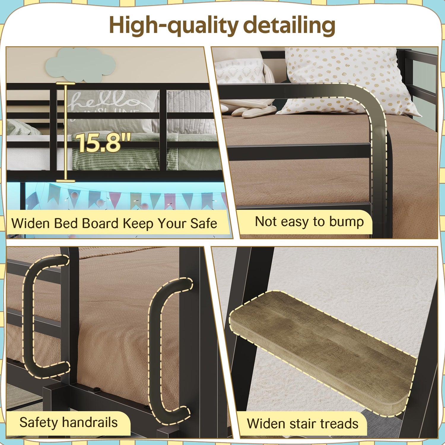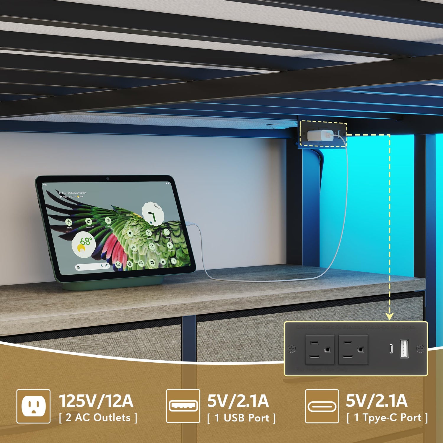 - 【LED Lights and Charging Stations】Full size loft bed frame comes with RGB LED light,remote control via APP,Over 60,000 colors and 29 flashing modes.LED lights with music sync function,LED light color will change with the rhythm of the sound and music.full loft bed Made for littles, Loved by parents.Loft bed kids charging station can be installed wherever you find it appropriate, includes 2-Outlets & 1 USB Port and 1 Type-C to provide power for up to 4 devices simultaneously.