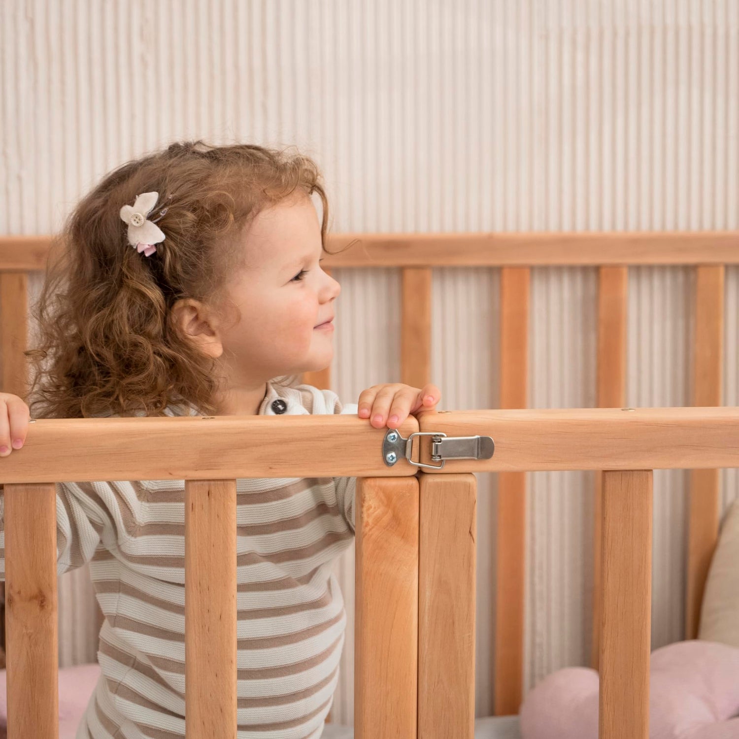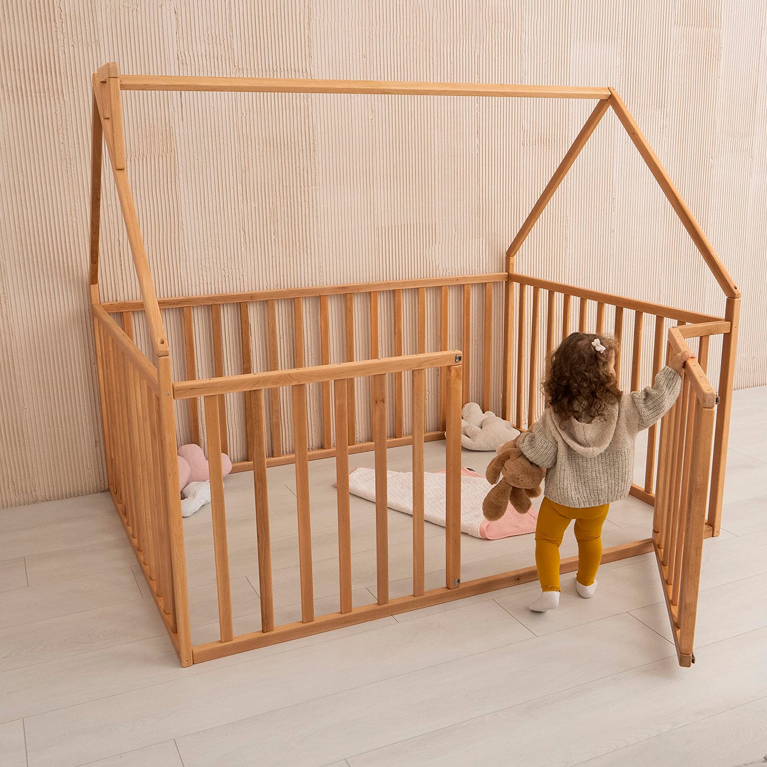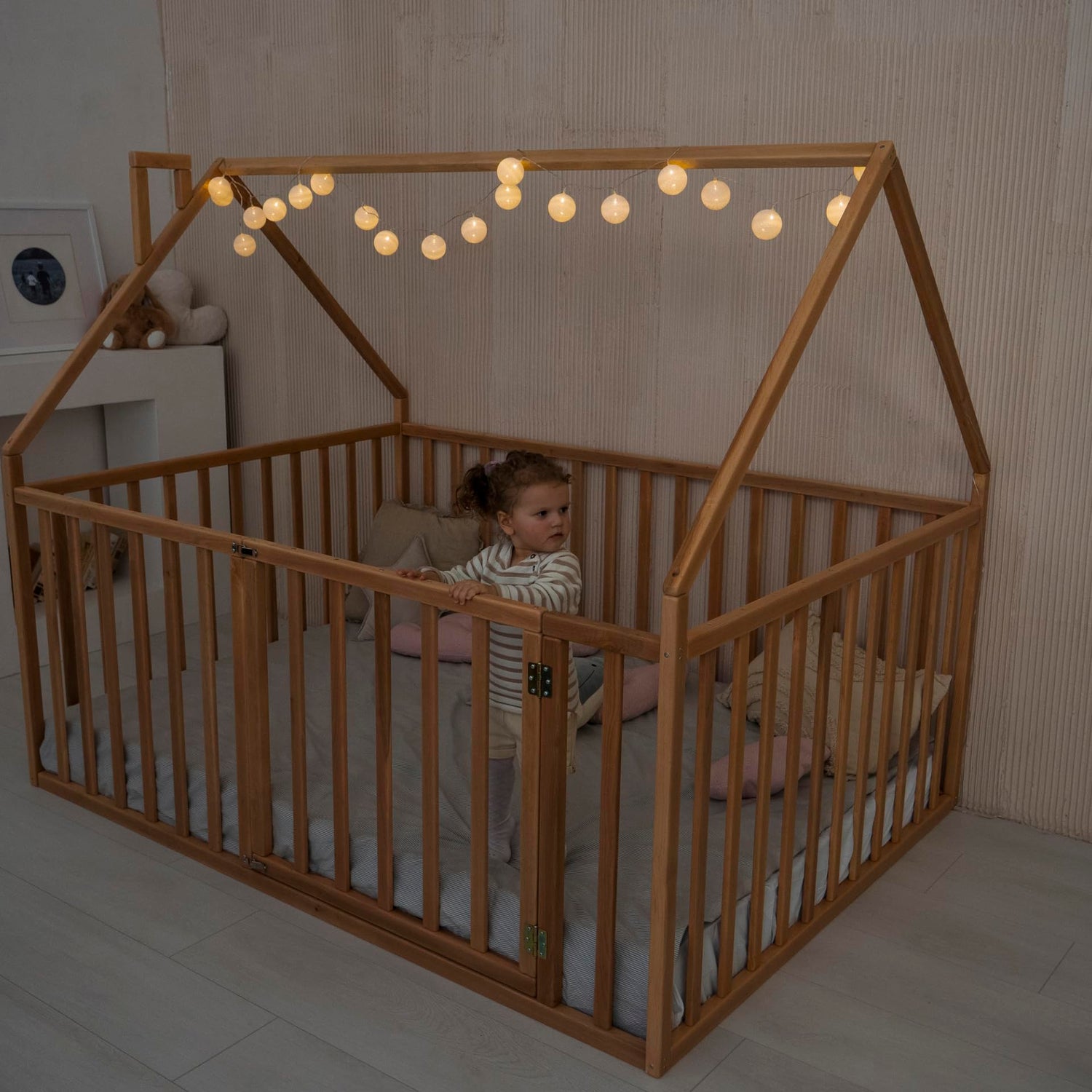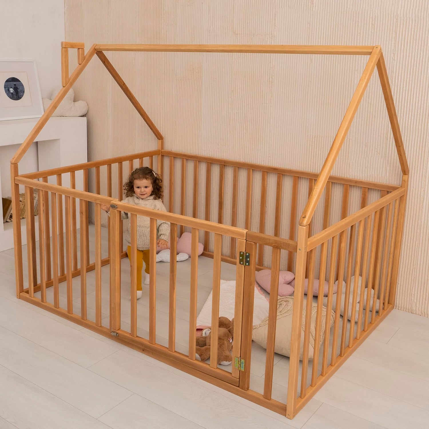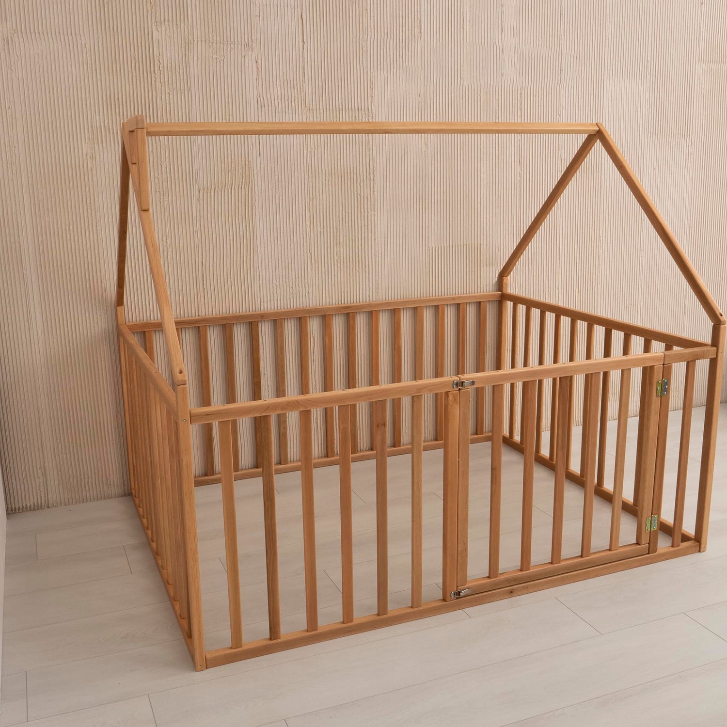 The Montessori playpen bed has 31.5-inch side rails.
