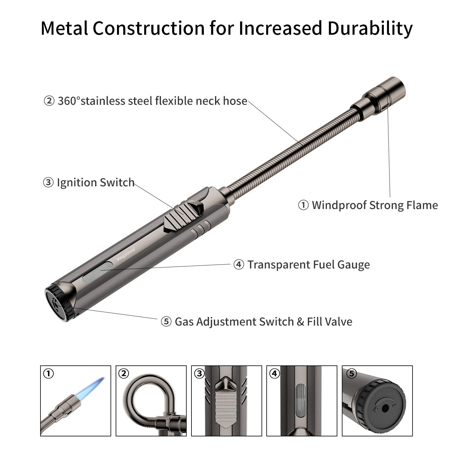 - [360° Rotation Soft & Flexible Elbow]-This butane lighter has 13cm long 360° flexible stainless steel hose,12cm long stainless steel pipe and 40CM in total length. The long-handled gas lighters can rotate at will conveniently and bend to any angles for your needs, which is handy and safe especially for cookers, wild explorer, wood burners, large candles.
