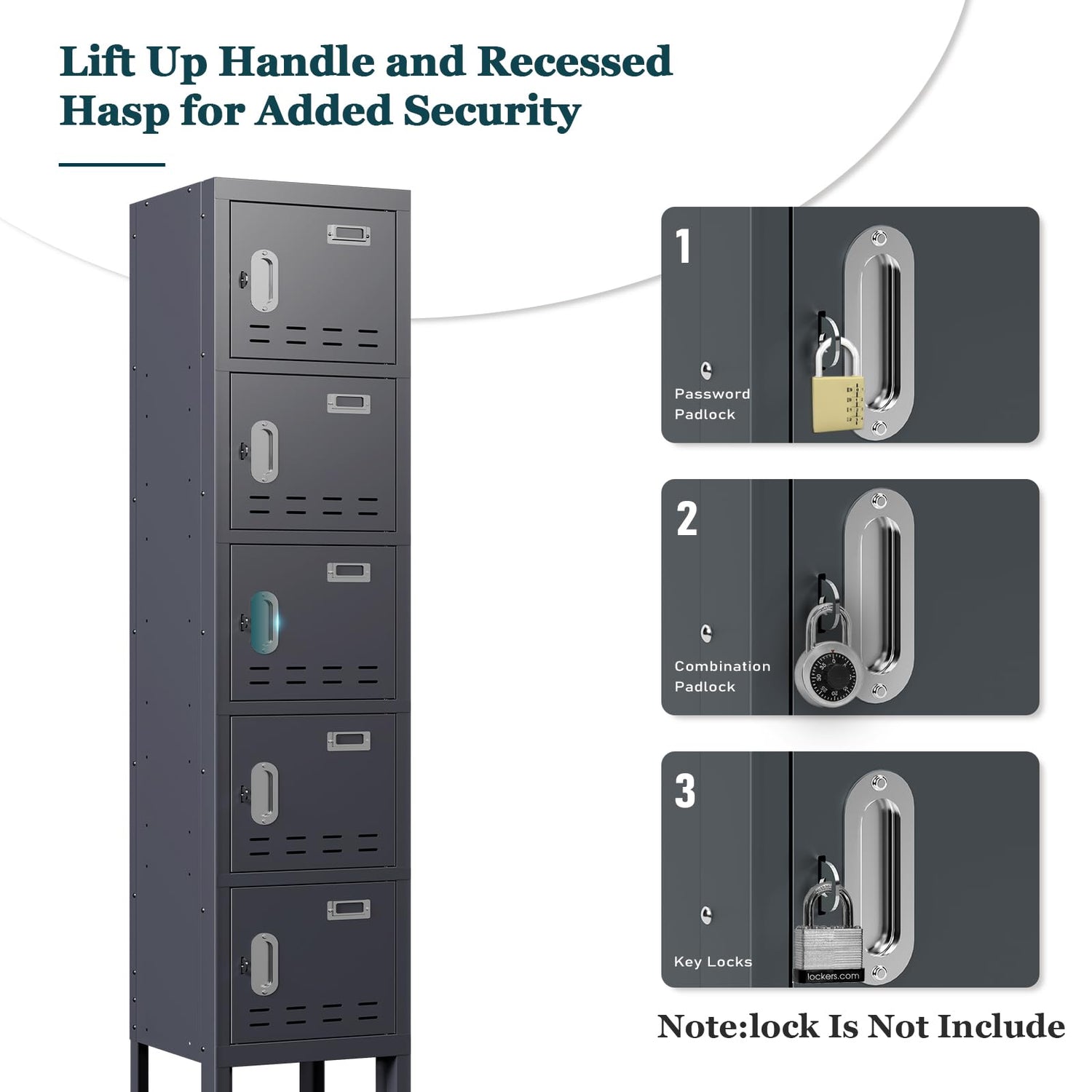 - 【Metal Locker Storage Cabinet】Each locker compartment include a lift up handle and recessed hasp for added security and can accommodate built-in combination or key locks and combination or key padlocks. padlocks.
