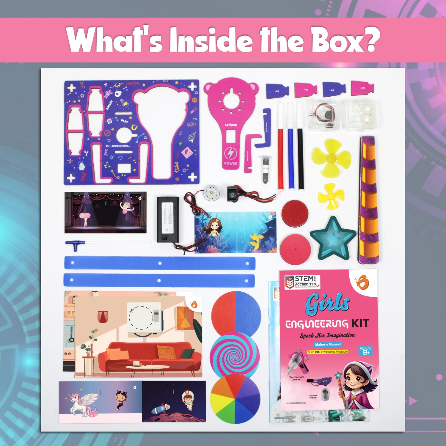 - ⭐ [DIY Engineering Science Kit for Girls Age 8-12]: This STEM DIY kit includes 50 pieces of circuit that can be transformed into numerous exciting prototypes. Build a Vacuum Cleaner toy, Spin Art machine, Magic Wand, Tornado mixer, hovercraft, static mixer, crazy bug, animation illusion, Earth model, 2D-3D shapes, centrifuge mania, color mixer, motorboat, Draw Robot and more!