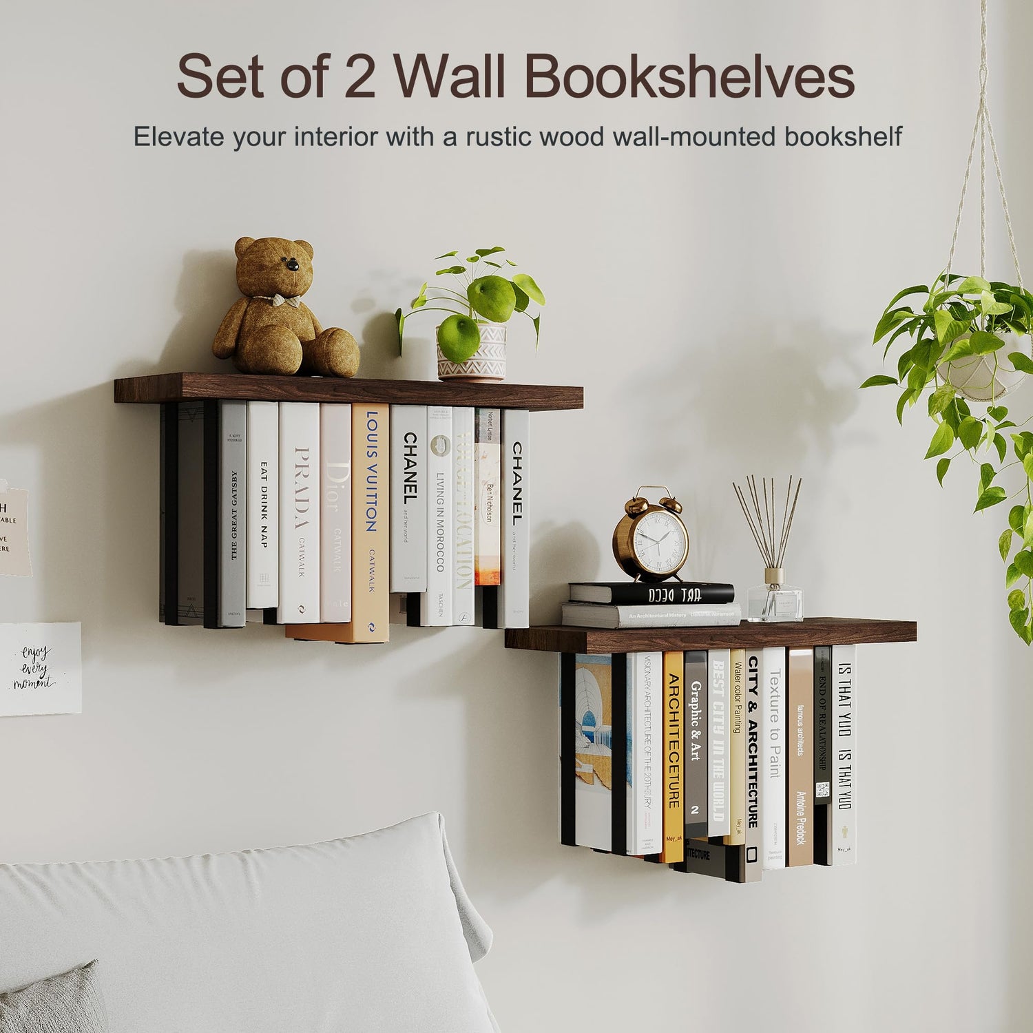 BUTUNITA Floating Bookshelves for Wall, Rustic Wood Hanging Wall Bookshelf, Upside Down Book Shelf and Wall Mounted Bookshelves for Home Decor in Bedroom, Living Room, Carbonized, 2 Pack