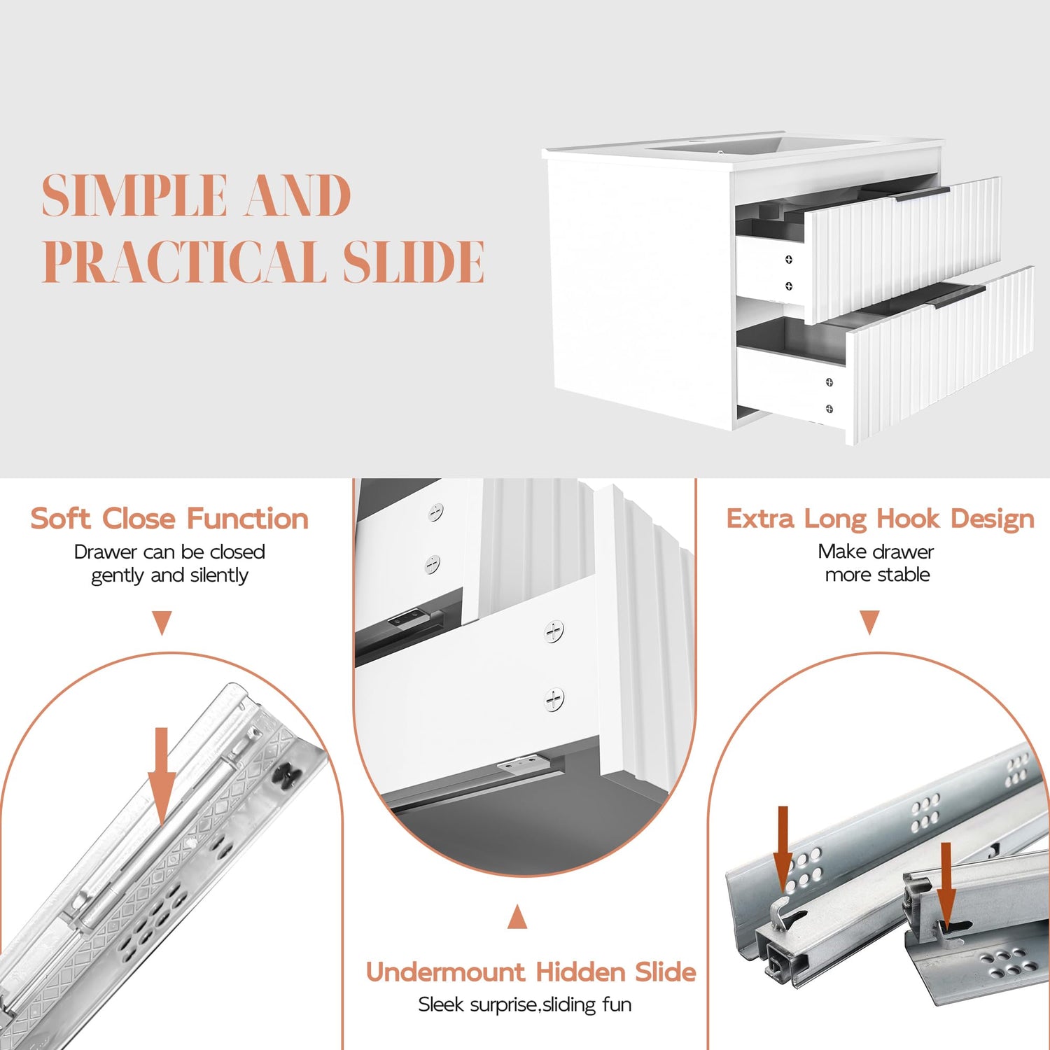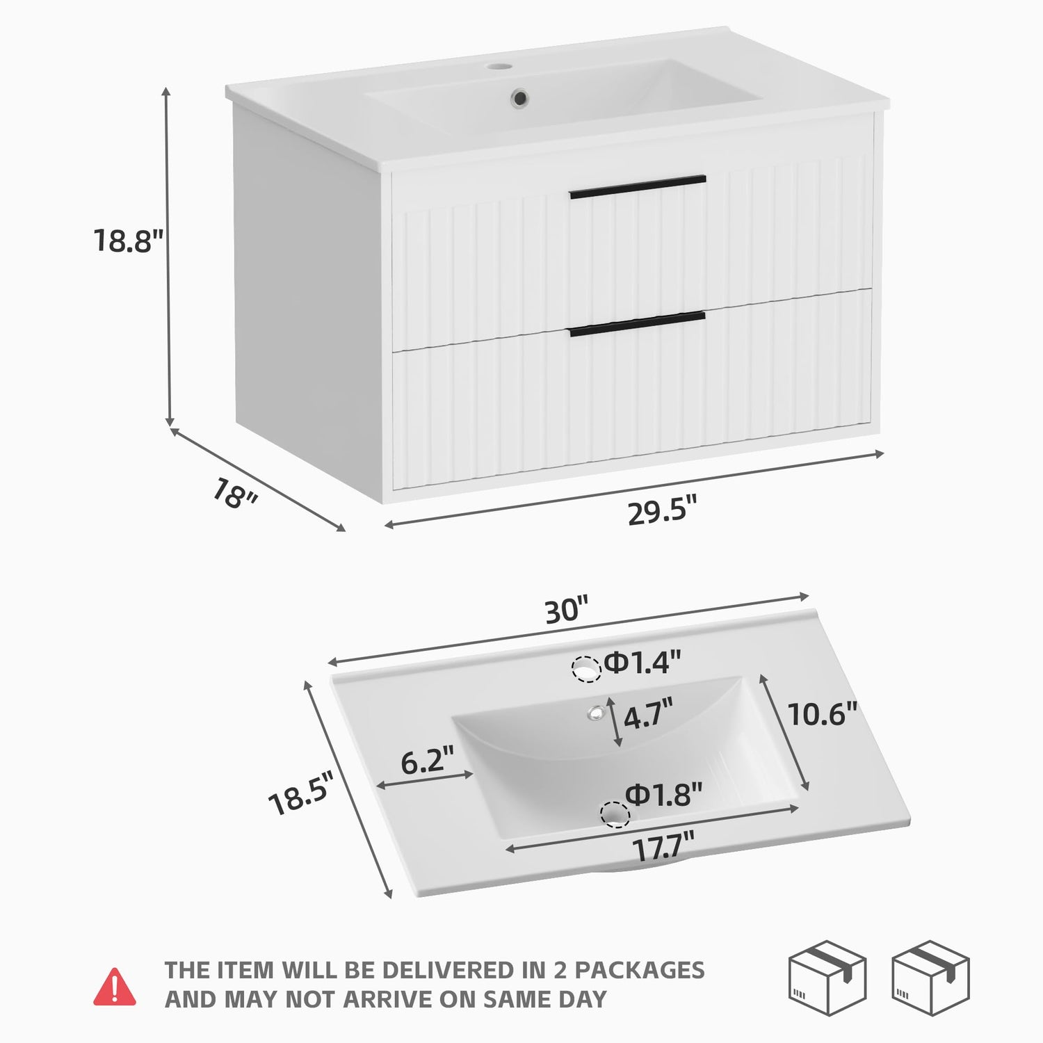 Buytime 30" Bathroom Vanity with Sink, Floating Vanity Bathroom Sink Cabinet Wall Mount, Soft-Close Function 2 Large Drawers, Grooved Stripe Design, Hidden Damping Drawers, White