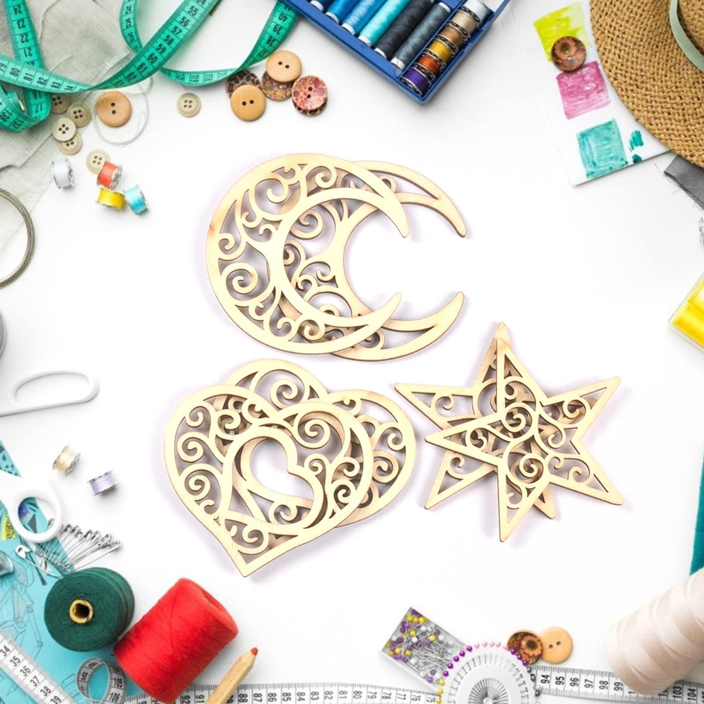 BUZHI 10 Pcs Wooden Moon Star Ornaments,Unfinished Moon Star Heart Shape Hollow Wooden Chips Wood Slices for DIY Eid Ornament Hanging Pendant