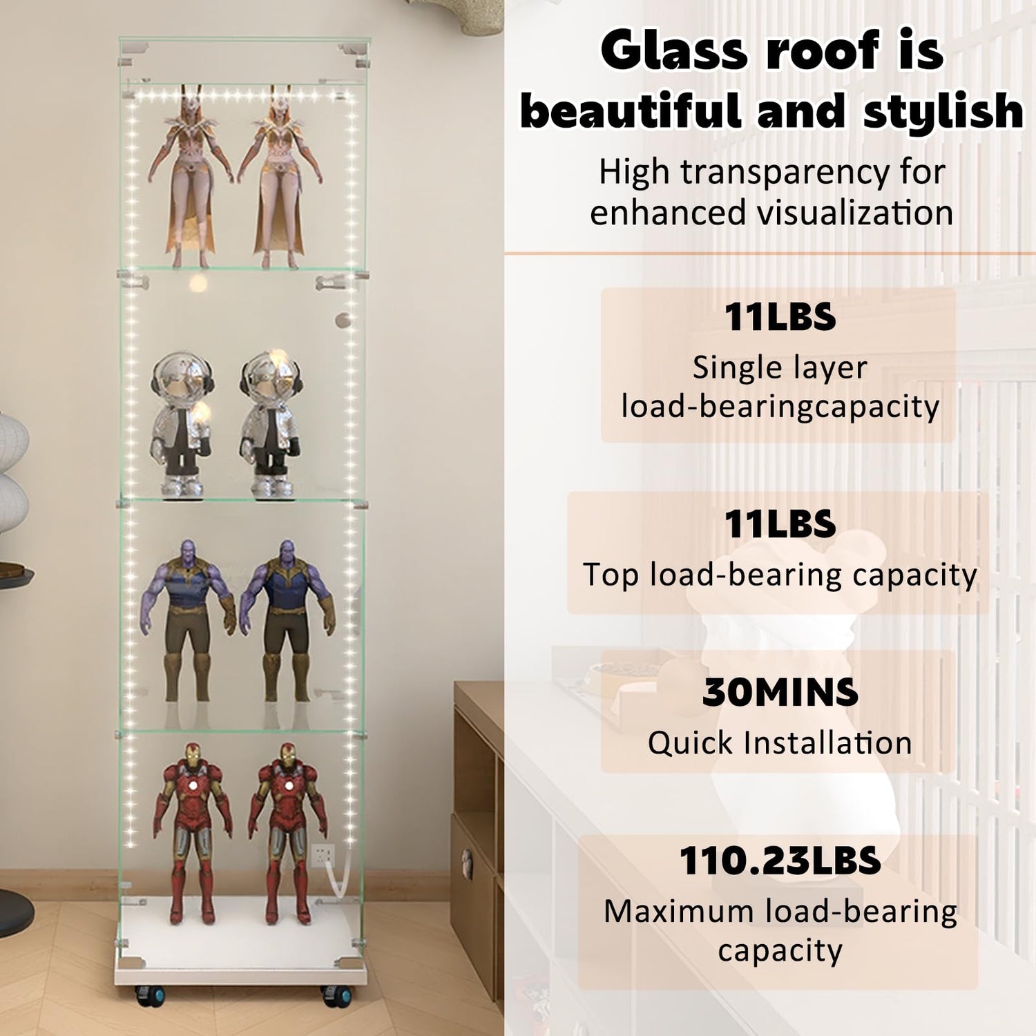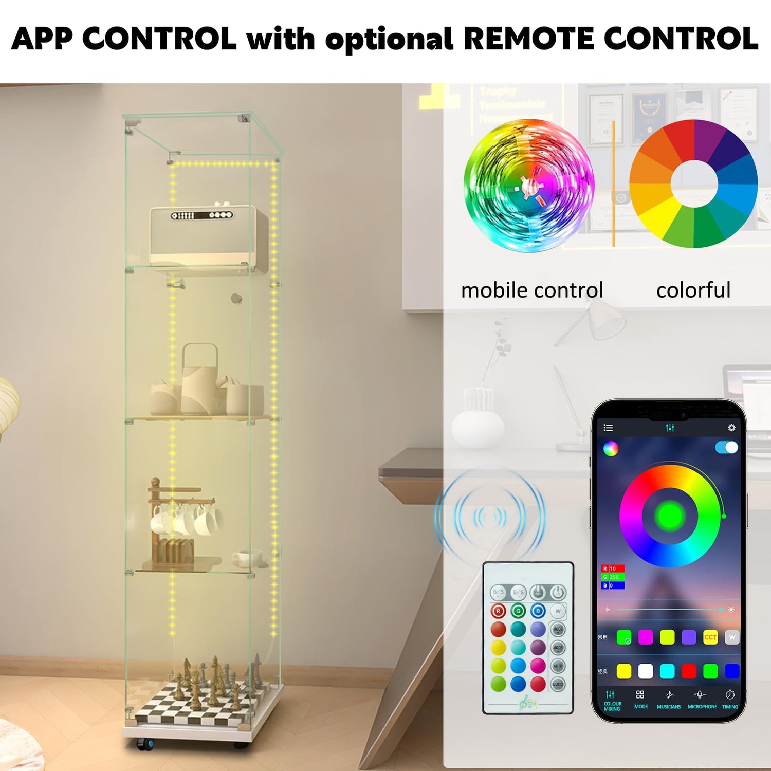- GLASS DISPLAY CABINET WITH WHEELS AND LIGHT STRIP: Intelligent LED light strip is 154 inches long with richer light color, which can be controlled by mobile APP and remote control, the light can be synchronized with music, and the placement style of the light strip can be freely adjusted to highlight the delicacy of the exhibits. Lockable universal wheels make it easy to move the position of the display case, suitable for different occasions and space requirements, improving the practicality of the product