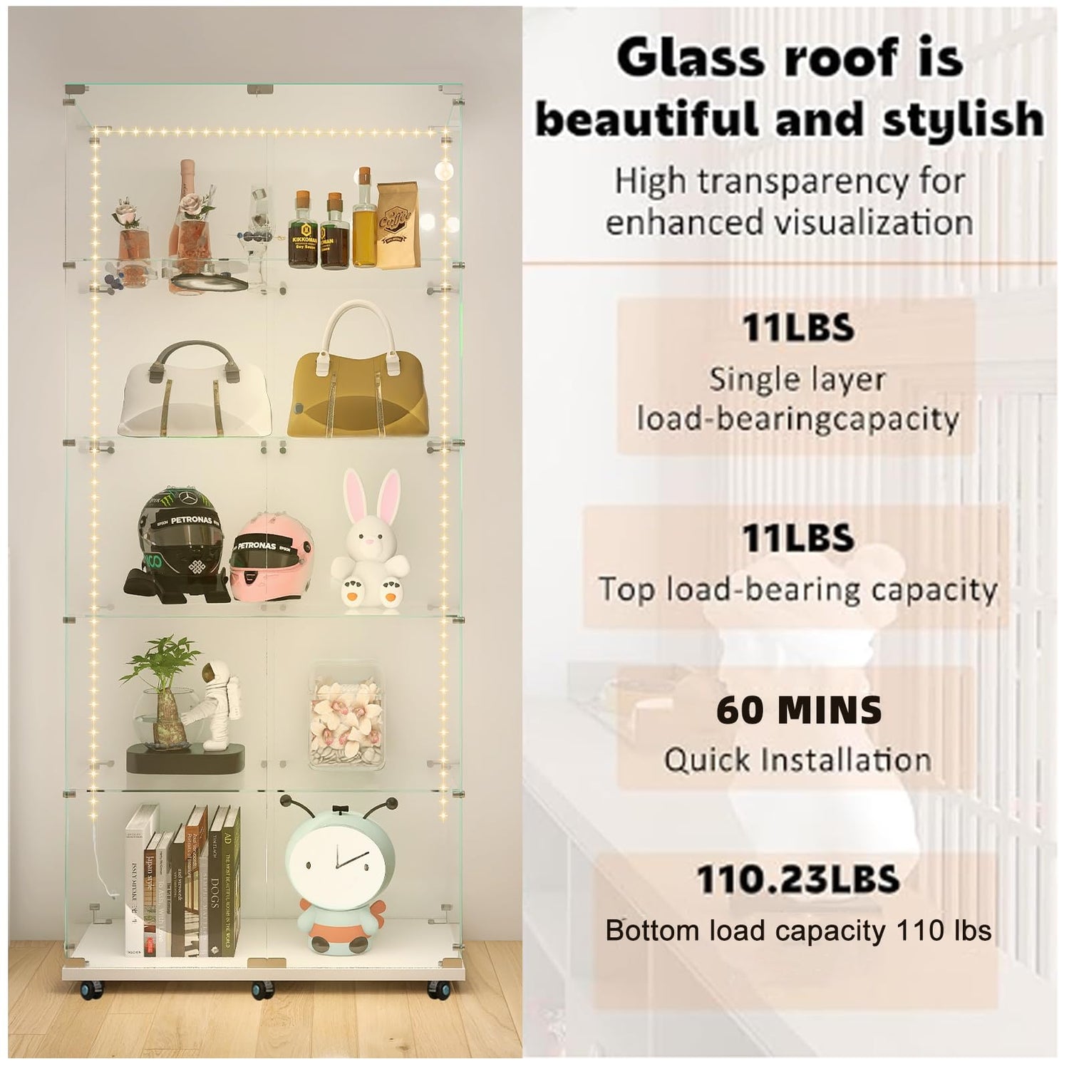 - GLASS DISPLAY CASE WITH WHEELS:lockable universal wheels can rotate 360° freely, convenient to move the position of the glass display case, accurate docking, prevent sliding, suitable for different occasions and space requirements, safety and practicality greatly increased.The interior space is well-designed with multiple adjustable shelves to meet your needs for displaying exhibits of different sizes.