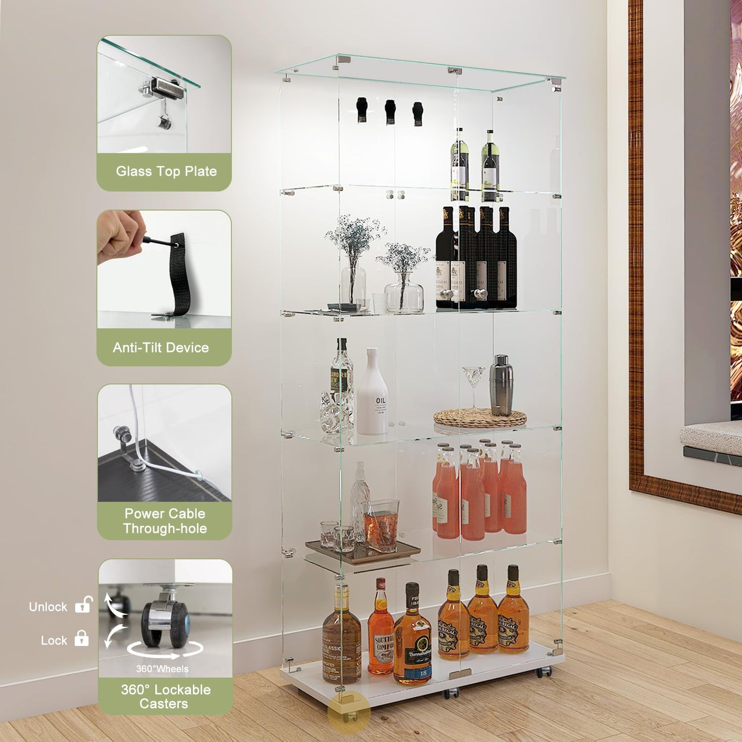 Buzleer Glass Display Cabinet with Lock LED Lighting 5-Tier 2-Door Curio Cabinets Full Vision Showcase Tempered Glass Display Case with Wheels for Living Room Bedroom Office, 74.6"*30.9"*13.6",White