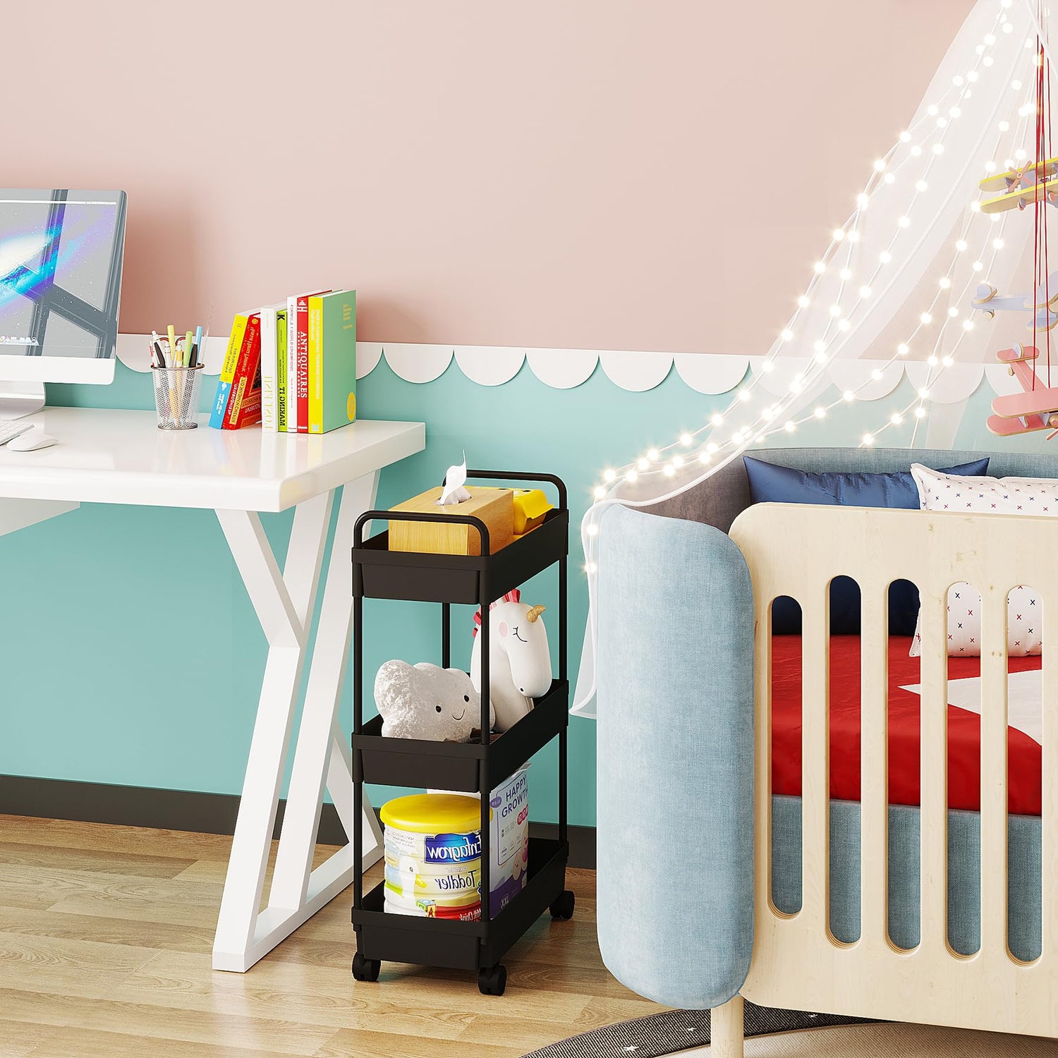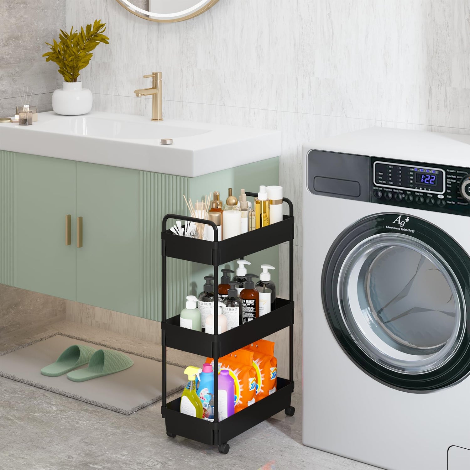 Buzowruil Rolling Storage Cart 3 Tier Organizer Mobile Shelving Unit Storage Rolling Utility Cart with Wheels for Kitchen Bathroom Laundry,Black