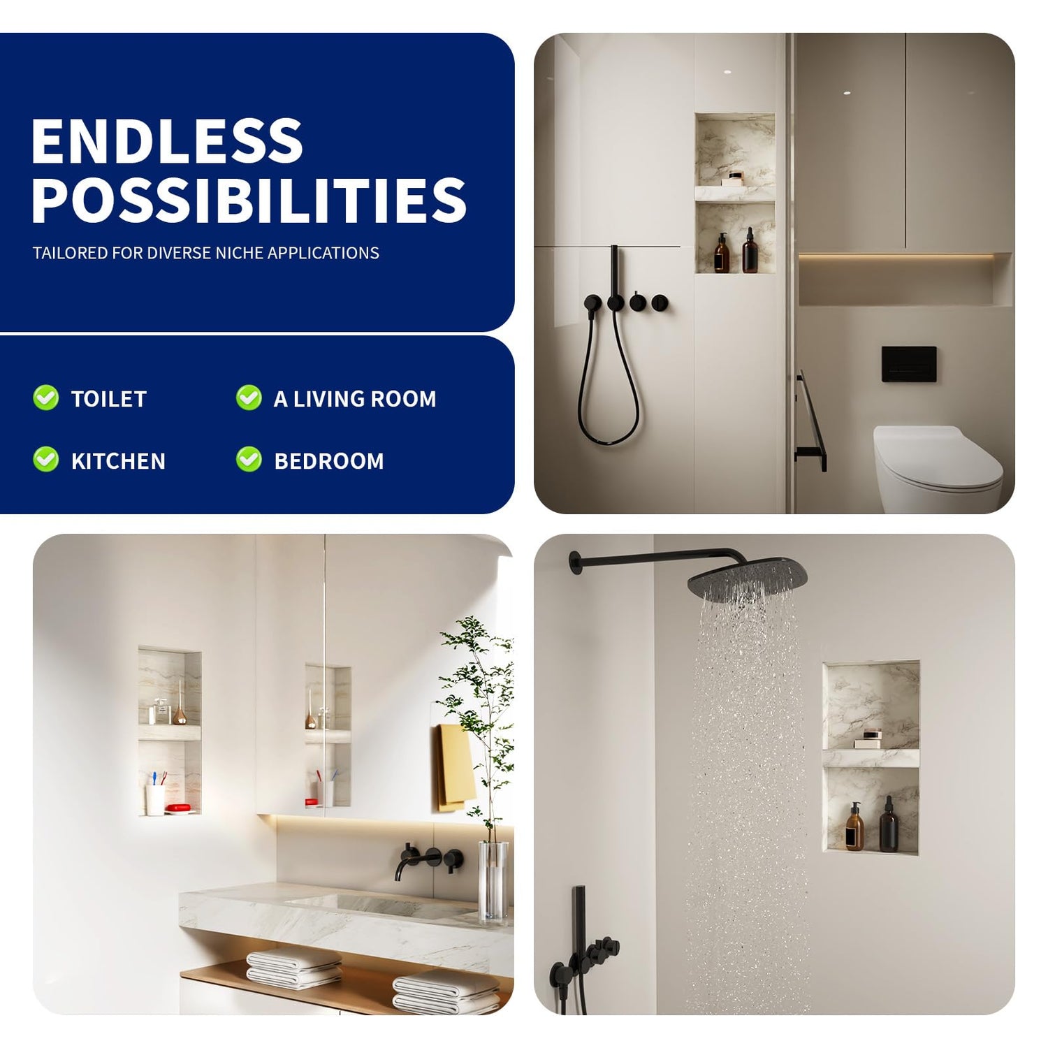 - Sealed and Waterproof: Our bathroom niche is made of high-quality and durable materials, completely sealed, waterproof, and moisture-proof.It can effectively prevent water from seeping into the walls, protect the walls, and keep the interior dry.