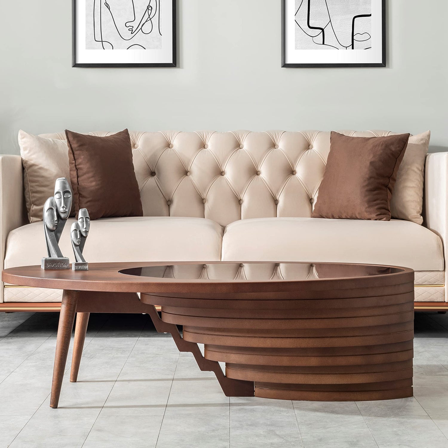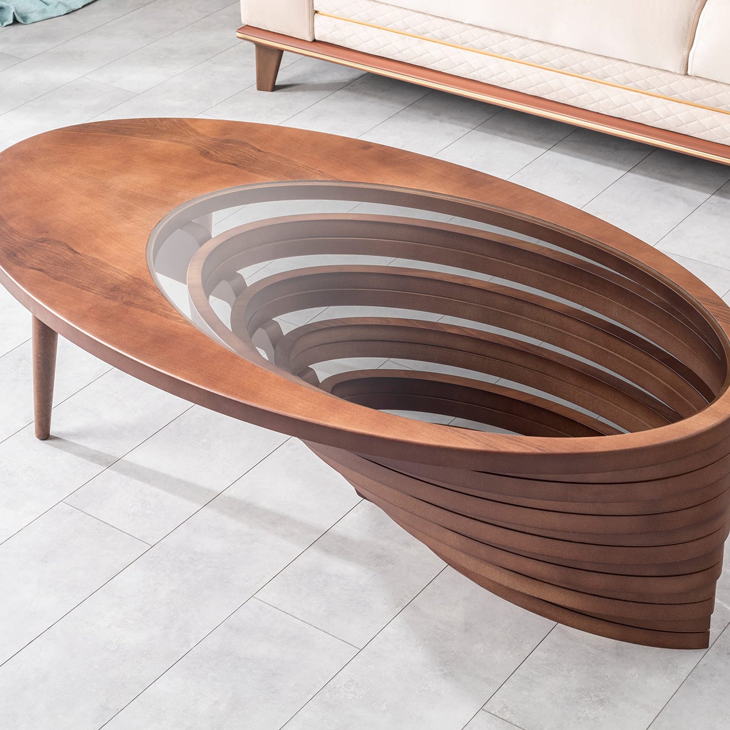 by Papella Design, Natural Walnut Veener Coffee Tables for Living Room, Rustic Table, Mesa De Centro para Sala, Center Table, Glass Table top, Walnut Color, (Drop)