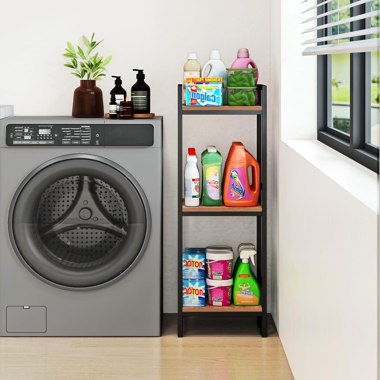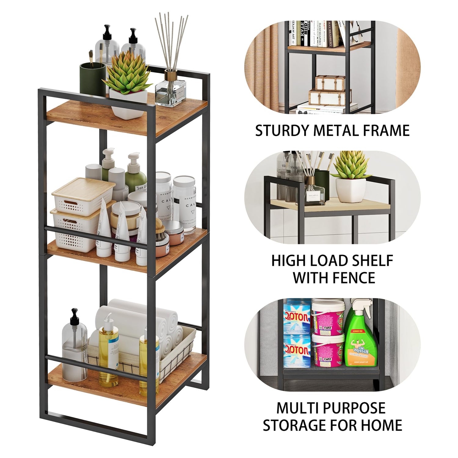 BYFU 3 Tier Bathroom Shelving Unit, Narrow Open Floor Shelves, Metal Corner Storage Rack for Bathroom Laundry Room Kitchen Living Room, Rustic Brown