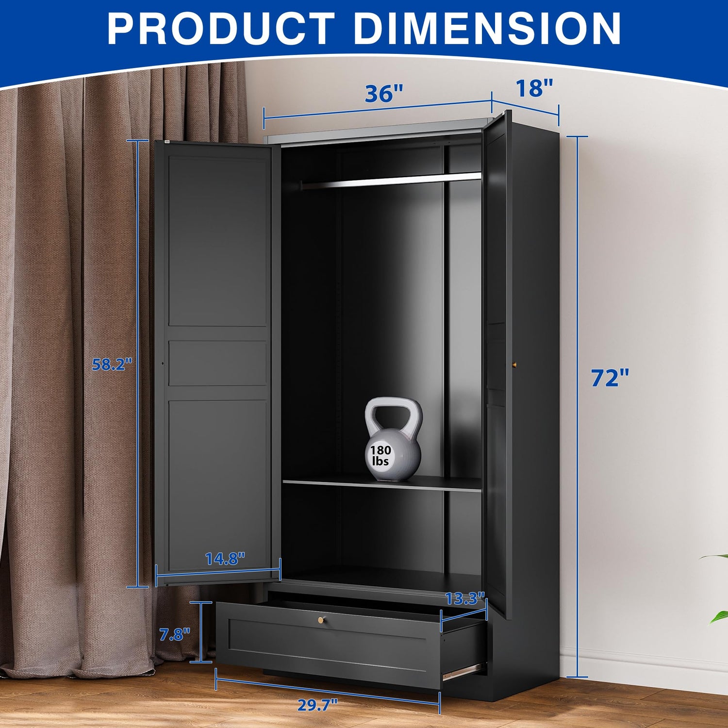 BYNSOE Metal Armoire Wardrobe Closet with 2 Doors 72'' Wardrobe Cabinet with Drawers and Hanging Rail Metal Closet with Adjustable Shelves for Bedroom. (Black, with 1drawer)