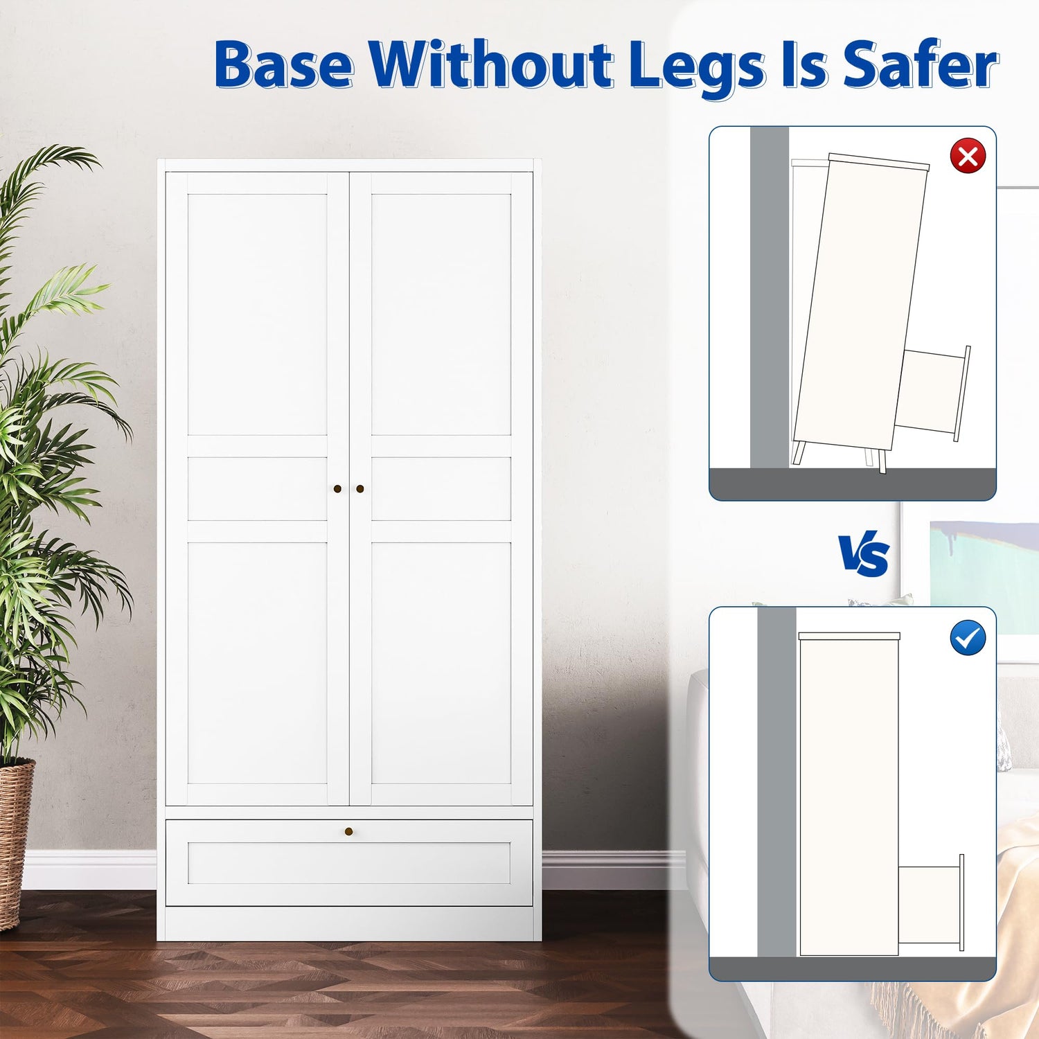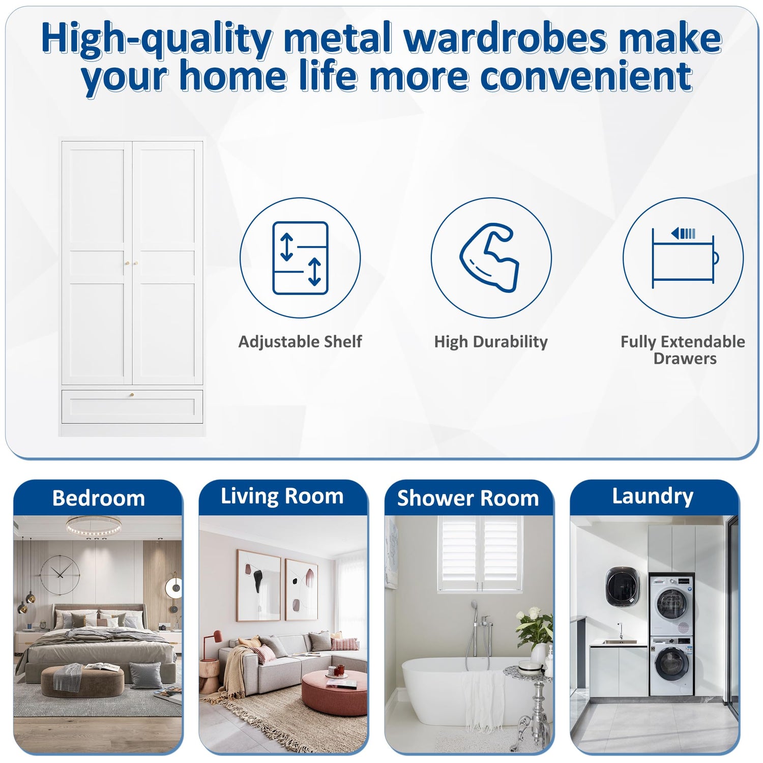 BYNSOE Metal Armoire Wardrobe Closet with 2 Doors 72'' Wardrobe Cabinet with Drawers and Hanging Rail Metal Closet with Adjustable Shelves for Bedroom. (White, with 1drawer)