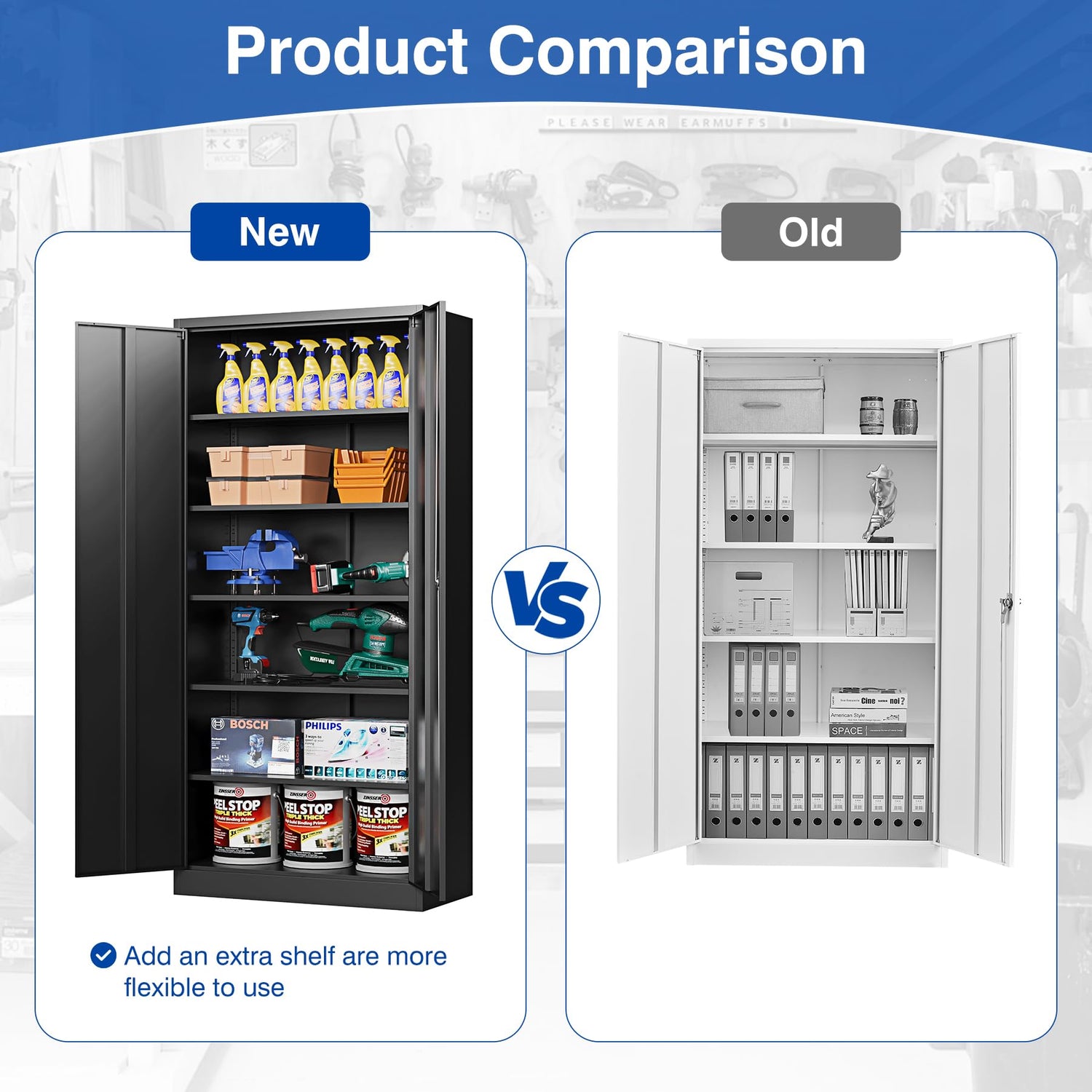 - 【Adjustable Shelf Height】The Metal Storage Cabinet has 5 adjustable partitions to accommodate items of different heights such as books, toys, kitchen supplies, toiletries, and garage tools. Suitable for garage, bathroom, kitchen, living room, study, office, as a storage cabinet. Use internal space more reasonably.