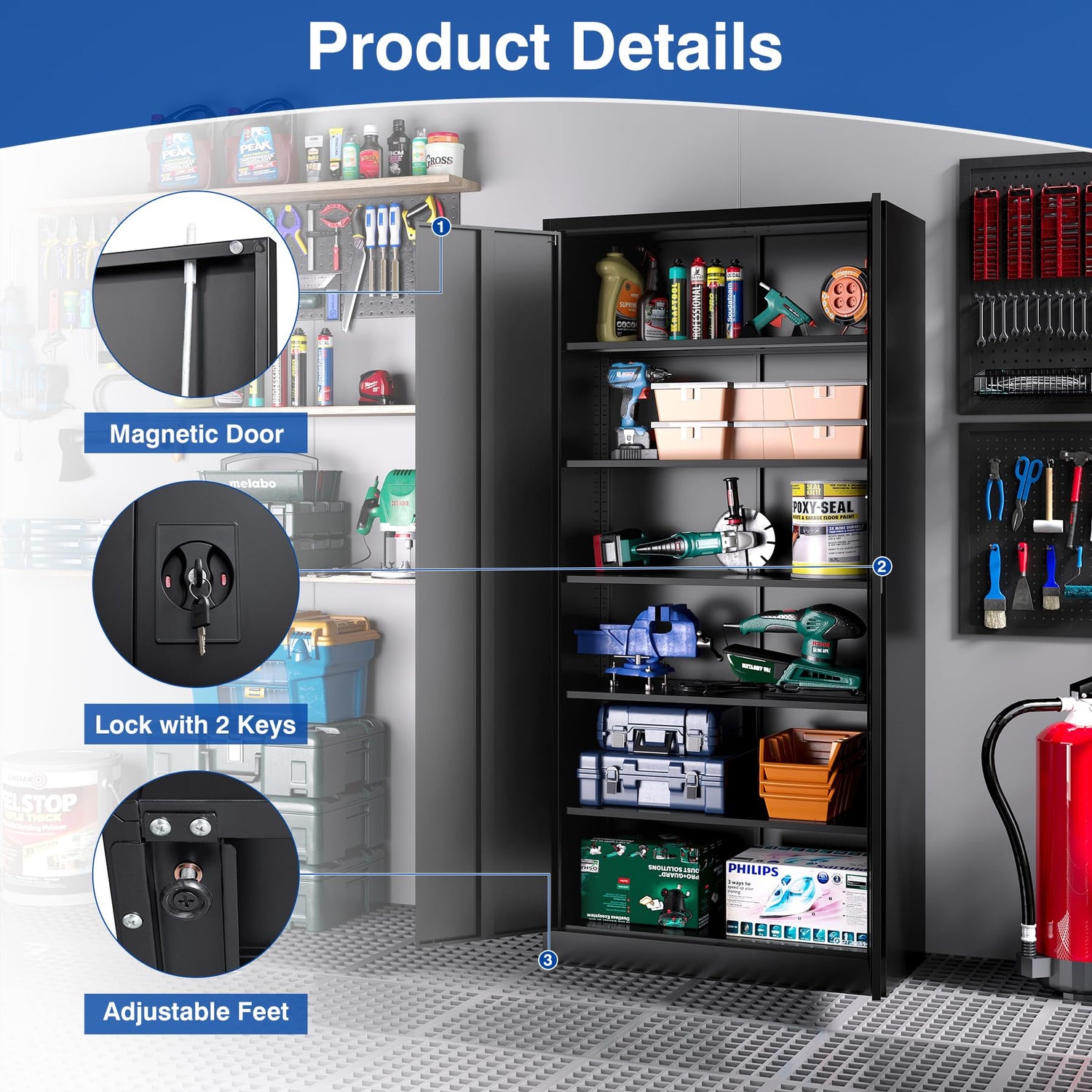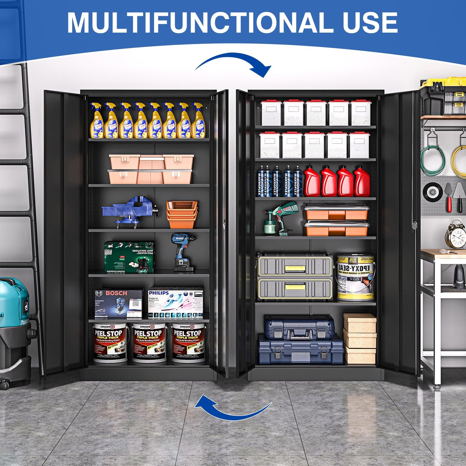 BYNSOE Metal Garage Storage Cabinet with 5 Adjustable Shelves Metal Locking Cabinet with Door Lockable Steel Tool Cabinets Door for Home, School, Office, Garage (Black, 71 inch)