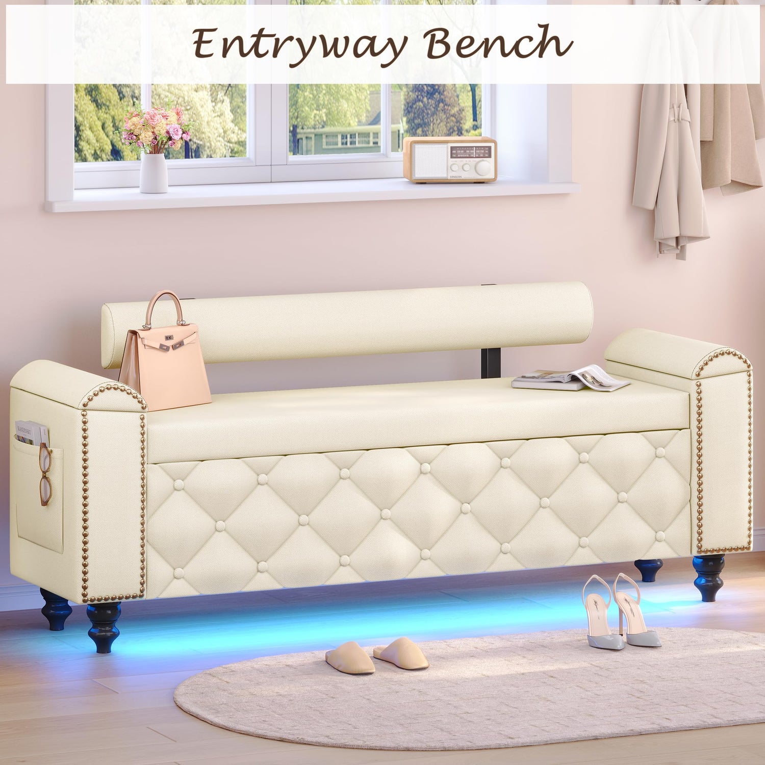 BYSAUD 51" Storage Bench, End of Bed Bench with LED Lights & Curved Arm, Upholstered Ottoman Bench with Storage, Bedroom Bench with Tufted Button & Nailhead Trim for Living Room Entryway, Beige